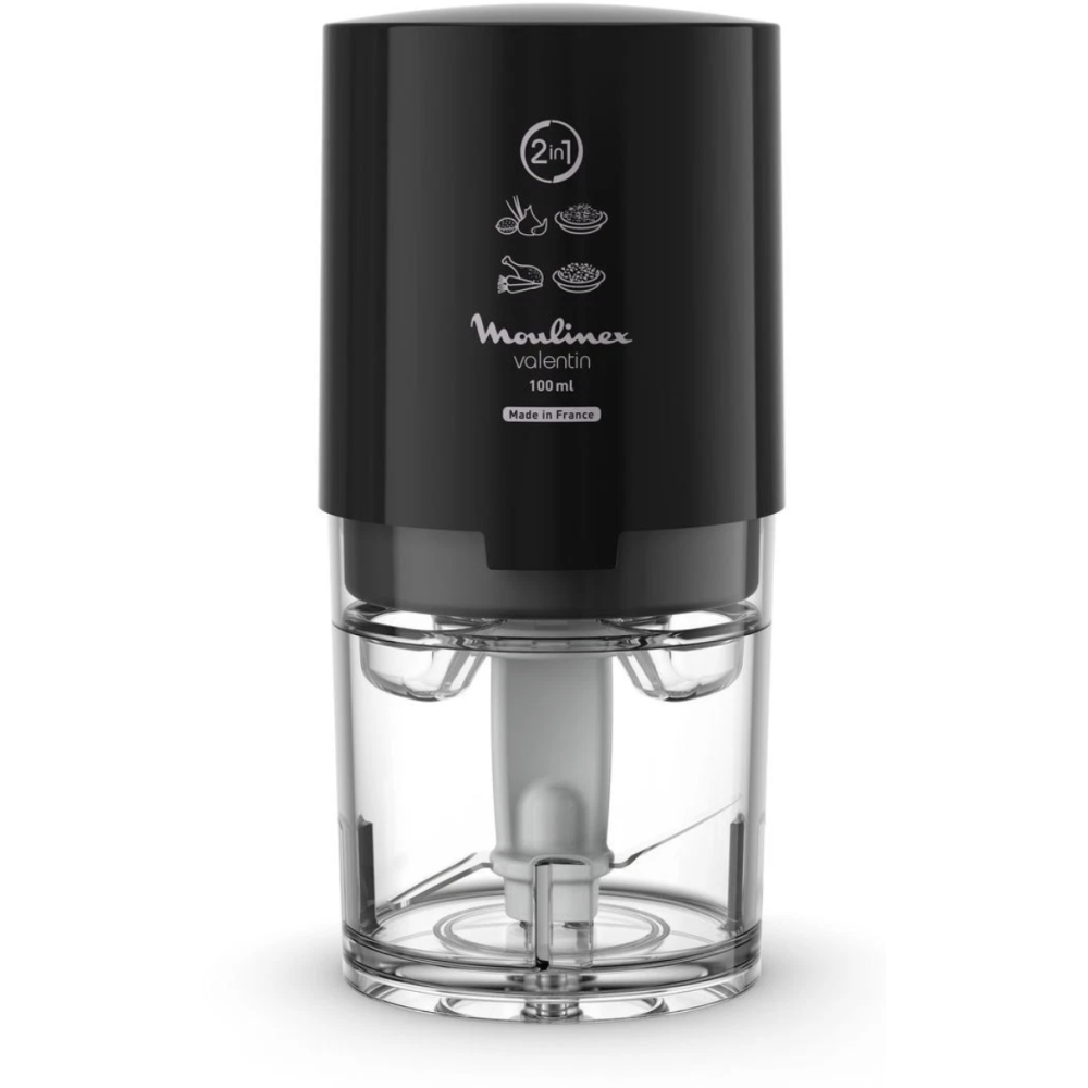 Valentin Mini Hachoir Moulinex DJ120810 est un hachoir électrique compact de 220 W conçu pour hacher et émincer sans effort de petites quantités d’ingrédients (ail, oignons, herbes, noix…). Sa fonction 2-en-1 permet de hacher et couper facilement grâce à un système à pression simple : il suffit d’appuyer sur le haut de l’appareil. Les lames se rangent directement dans le bol pour un rangement pratique. Le bol et les lames sont compatibles lave-vaisselle pour un nettoyage rapide. Capacité : 50 ml. Produit fabriqué en France.
