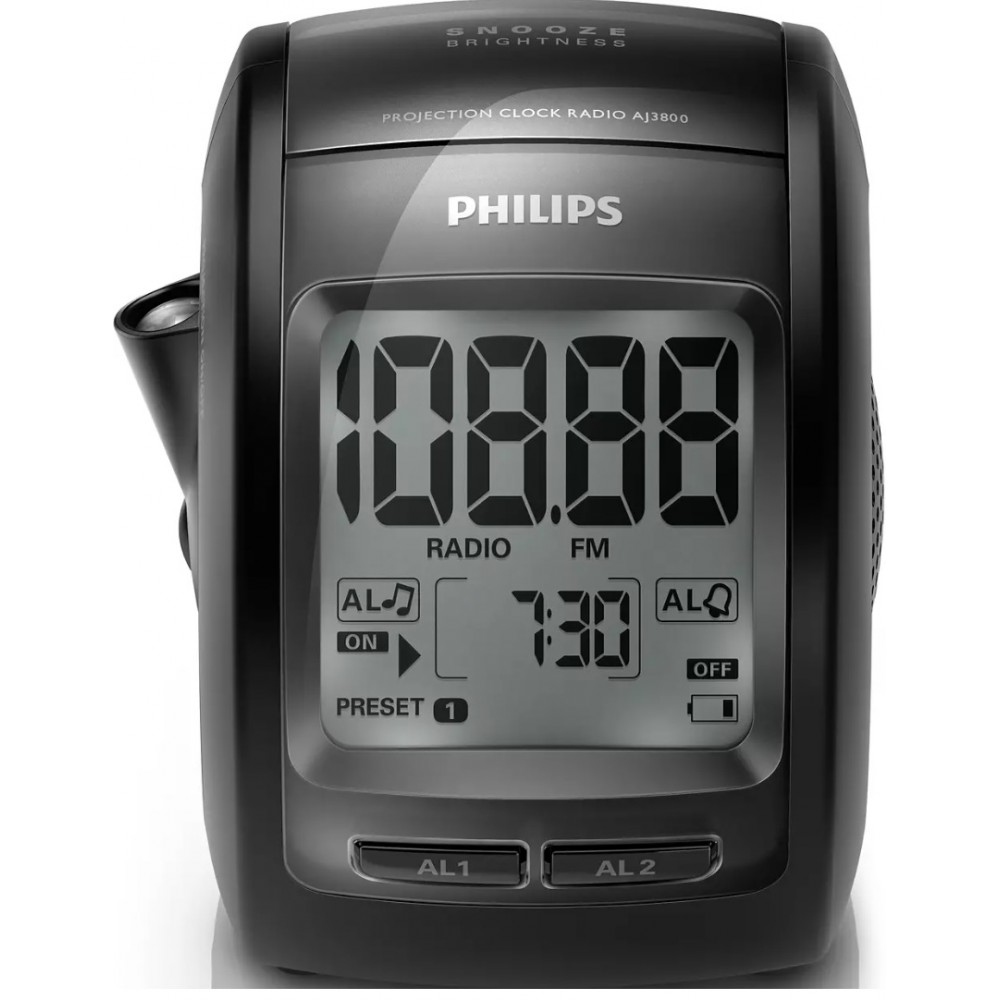 Pour que chaque journée soit unique, optez pour ce radio-réveil Philips - Sa particularité : il projette l'heure sur n'importe quelle surface - Vous n'avez qu'à ouvrir les yeux pour voir l'heure ! La matinée ne peut pas mieux commencer ! Type : Radio-réveil - Marque : PHILIPS - Référence : AJ3800/12 - Type d’horloge : Numérique - Tuner : FM - Fréquences : 87,5 à 108 MHz - Sortie audio : Mono - Puissance : 80mW RMS - Écran : LCD - Alarmes : 2 - Source d’alarme : Radio FM / Buzzer - Répétition de l’alarme : Oui, 9min - Réinitialisation d’alarme : Oui, 24h - Mise en veille programmable : 15 à 120min - Alimentation : Prise Secteur / Batterie - Type de batterie : x4 piles AA (LR6) - Dimensions (mm) : 222 x 157 x 95 - Poids : 310g.