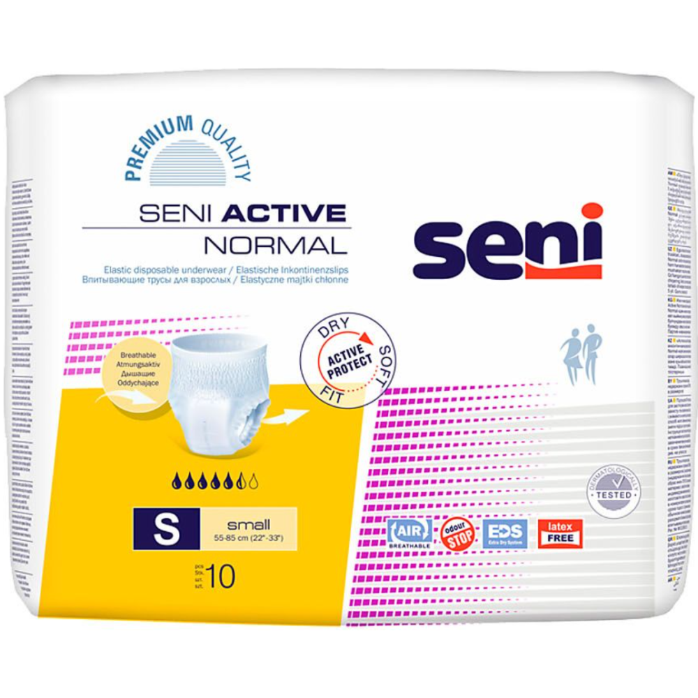 Les culottes jetables respirantes Seni Active Normal sont une excellente solution pour les personnes souffrant d'incontinence légère à modérée menant une vie active et pour celles impliquées dans la rééducation physique - Les culottes Seni Active Normal , qui peuvent être enfilées et enlevées comme des sous-vêtements ordinaires, sont une solution fiable pour les personnes actives qui apprécient la commodité et la sécurité.