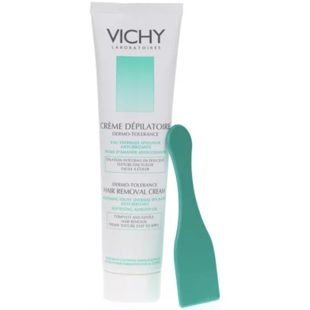 Crème dépilatoire Dermo-Tolérance Vichy 150 ml - Épilation rapide grâce à sa texture onctueuse et facile à étaler - La peau est parfaitement nette et douce, préservée pendant l'application - Formulée avec de l'Eau Thermale de Vichy et de l'huile d'amande adoucissante - Référence (EAN) : 3337871305802.