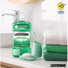 Utilisé deux fois par jour en complément du brossage. 20 ml (4 cuillères à café de 5 ml) dans un verre, à utiliser en rinçage autour des dents et des gencives pendant 30 secondes, puis recracher. Pour ouvrir : Presser le bouchon sur les côtés et tourner. Pour fermer : Tourner le bouchon jusqu'à ce qu'il se verrouille. Pour une protection complète, l'UFSBD recommande l'utilisation de ce bain de bouche quotidien, en complément du brossage, matin et soir. Ne convient pas aux enfants de moins de 12 ans. Ne pas avaler. En cas d'ingestion, consulter un médecin. N'utilisez pas le produit si vous êtes allergique à l'un de ses ingrédients. En cas d'irritation buccale, interrompre l'utilisation et consulter un dentiste. Tenir hors de portée des enfants. Indication : Une protection pour des dents plus fortes et des gencives plus saines en 2 semaines - Ingrédients: Aqua, Alcohol, Sorbitol, Poloxamer 407, Benzoic Acid, Zinc Chloride, Sodium Saccharin, Eucalyptol, Aroma, Sodium Fluoride, Methyl Salicylate, Thymol, Sodium Benzoate, Menthol, CI 47005, CI 42053.