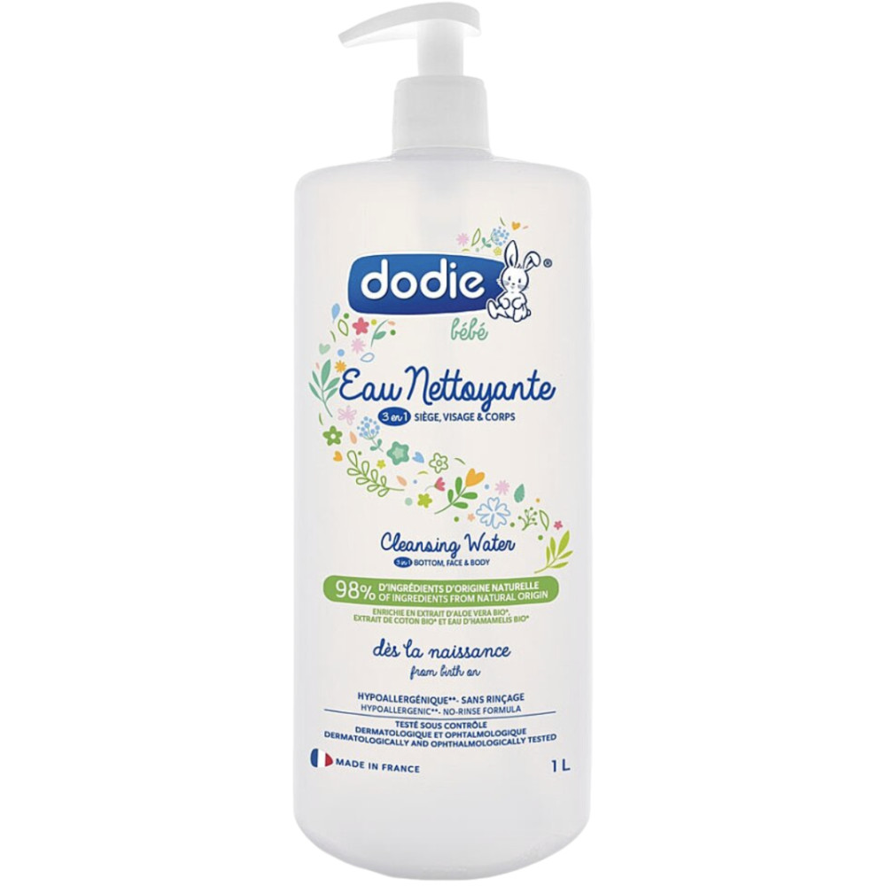 Eau nettoyante Dodie 3 en 1 1L - Formulée à base de 99% d'ingrédients d'origine naturelle - Ingrédients principaux : extrait d'aloé vera bio, extrait de coton bio, eau d'hamamélis bio - Sans rinçage : pratique pour un nettoyage rapide et doux.