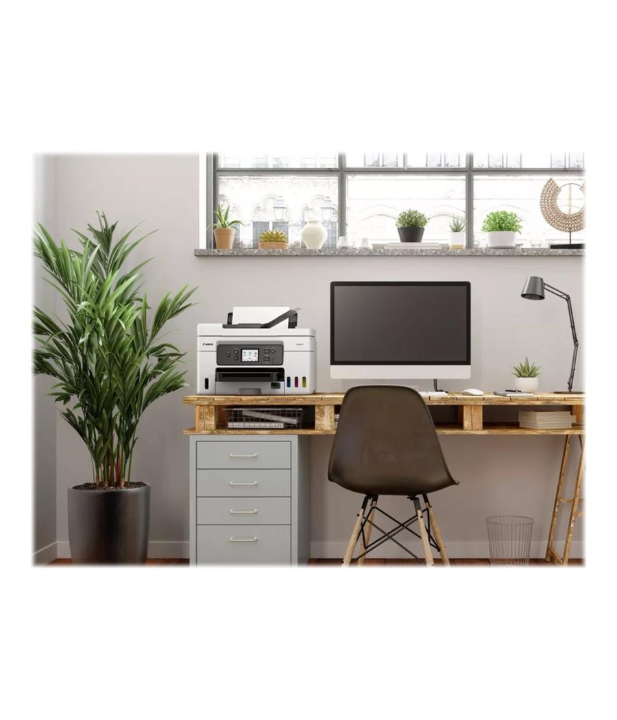 Imprimante couleur Canon GX2040 Megatank (4-en-1 : impression, scan, copie, fax) - Écran tactile 2,7" - Vitesse : 15 ipm noir, 10 ipm couleur - Résolution : impression 600×1200 dpi, scan 1200×2400 dpi - ADF 35 feuilles, duplex auto, cassette 250 feuilles - Connexions : USB, Wi-Fi, Ethernet - Compatibilité : Windows, macOS, ChromeOS, iOS, Android - Encres : GI-45 BK/C/M/Y (jusqu’à 3000–4500 pages) - Formats papier variés (A4, A5, enveloppes, etc.) - Dimensions : 374 × 380 × 225 mm - Couleur : blanc/noir - EAN : 4549292219739.