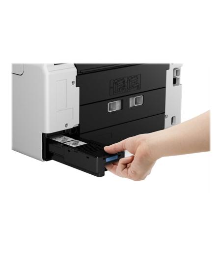Imprimante multifonction jet d’encre couleur (impression, copie, scan) - Format max : A4 - Vitesse : 24 ppm noir, 15,5 ppm couleur - Résolution impression : 1200 × 600 dpi - Scanner CIS : 1200 × 1200 dpi - Connectivité : Wi-Fi, USB - Bac papier : 250 feuilles - Fonctions : duplex automatique, impression mobile, impression photo, cloud - Écran : intégré - Couleur : blanche - Dimensions : 39,9 × 41 × 25,4 cm - Poids : 11,6 kg - Cartouches : encres séparées (tanks / MegaTank) - Inclus : tous les consommables de démarrage - EAN : 4549292240290.