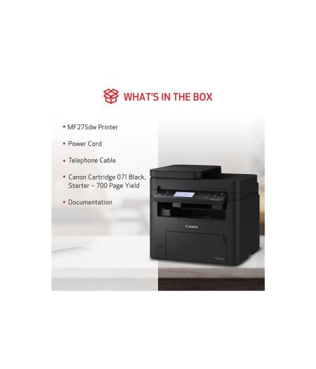 Optimisez votre production en imprimant, copiant et numérisant des documents à partir de périphériques fiables. Faxez avec le MF275dw, gagnez du temps avec l'impression recto-verso et utilisez une large gamme de supports de petite taille pour produire des documents au format A5 et A6R. - Protégez vos documents sensibles