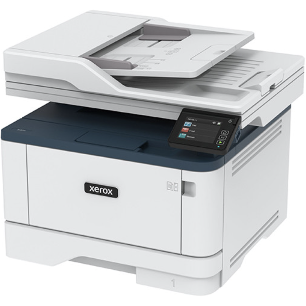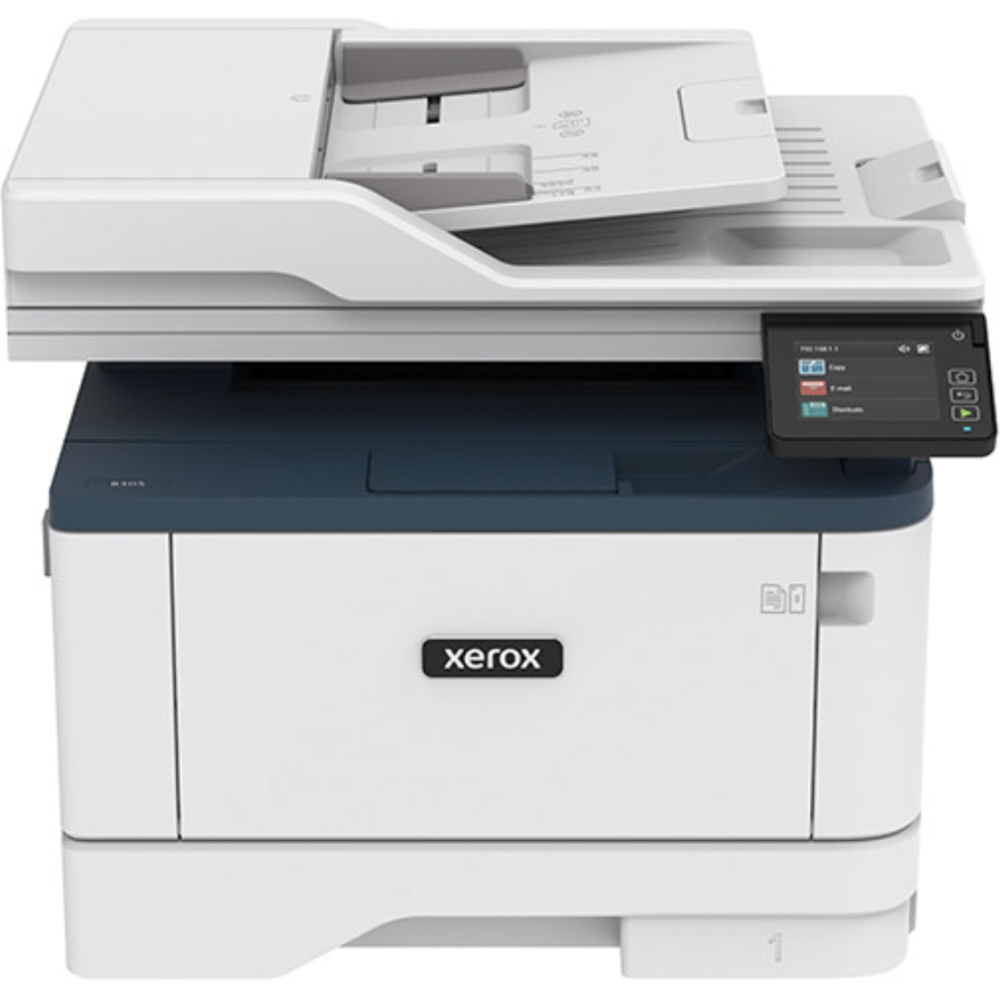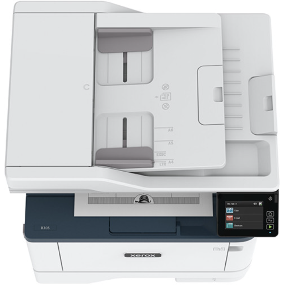 Imprimante multifonction : impression, copie, numérisation laser monochrome Xerox B305 3-en-1 - Vitesse : jusqu’à 38 ppm - Recto-verso automatique - Première page : 5,8 s (impression) / 5,3 s (copie) - Résolution : 600 × 600 dpi (qualité 2400) - Mémoire : 512 Mo – Processeur 1 GHz - Volume recommandé : 8 000 pages/mois (max. 80 000) - Connectivité : USB 2.0, Ethernet, Wi-Fi 802.11 b/g/n - Chargeur automatique 50 feuilles - Capacité papier : 250 + 100 feuilles (550 en option) - Sécurité avancée : impression confidentielle, TLS 1.3, WPA3 - Dimensions : 411 × 366 × 339 mm – Poids : 12,8 kg.