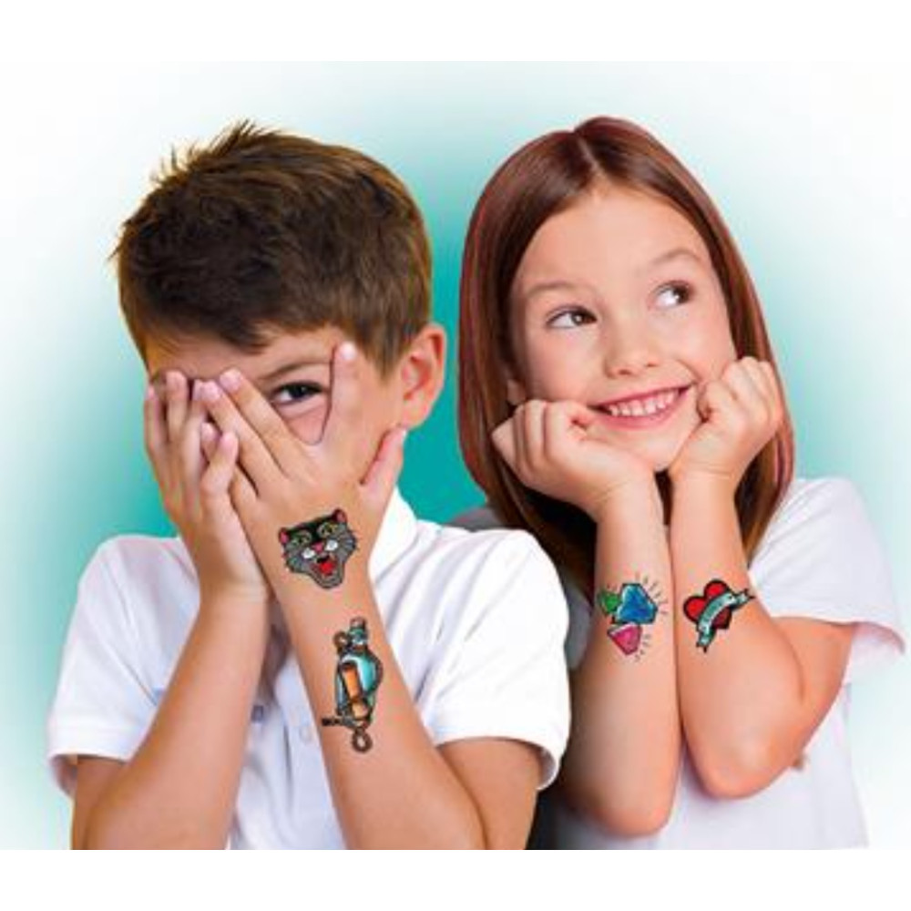 Votre enfant affirme son style avec ce coffret de tatouages éphémères - Un coffret comportant des tatouages transferts pour exprimer son style par le biais de sa peau ! Quelques-uns des tatouages sont recouverts d’un vernis spécial qui ne laisse pas entrevoir le dessin tant qu’ils ne sont pas appliqués sur la peau.