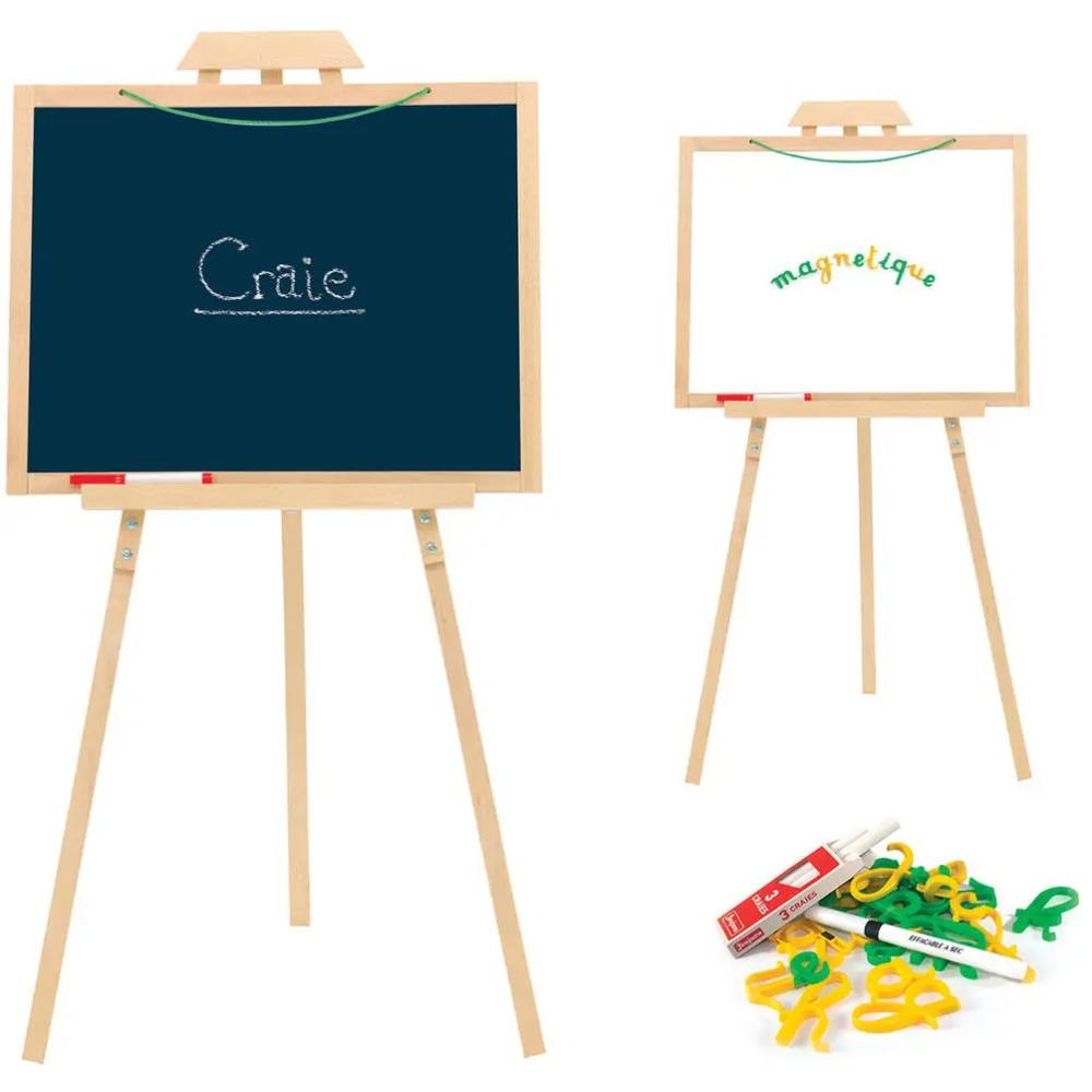 Chevalet créatif conçu en bois et composé d’une ardoise réversible et à suspendre sur un support à 3 longues pattes - Propose 2 faces d’écriture, dont 1 face pour écrire à la craie et 1 face blanche magnétique pour les feutres et les lettes aimantées - Fait une hauteur totale de 105 cm - Dispose d’une conception ergonomique et modulable grâce à ses pieds démontables - Dimensions de l’ardoise 56 cm de long et 43 cm de large - Fournie avec des lettres aimantées, un feutre et un petit carton de craie pour écrire à volonté - Recommandé pour les enfants de tout sexe dès l’âge de 3 ans.