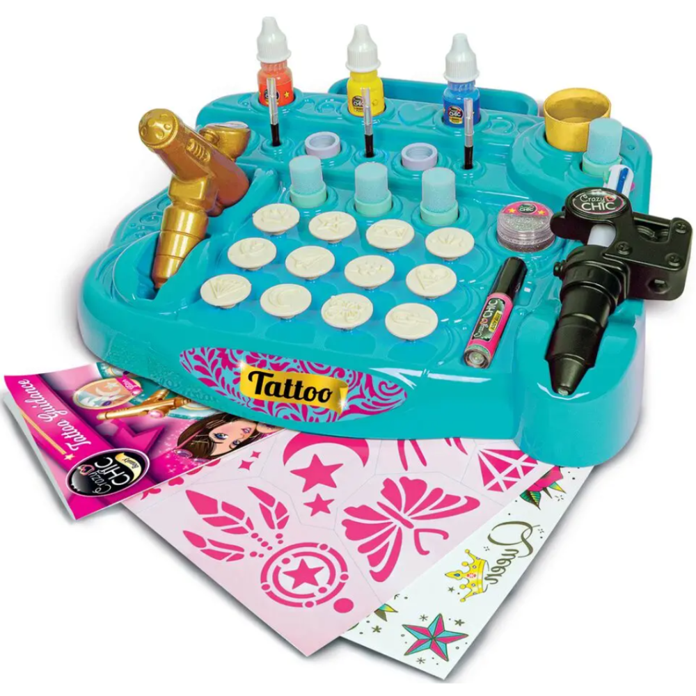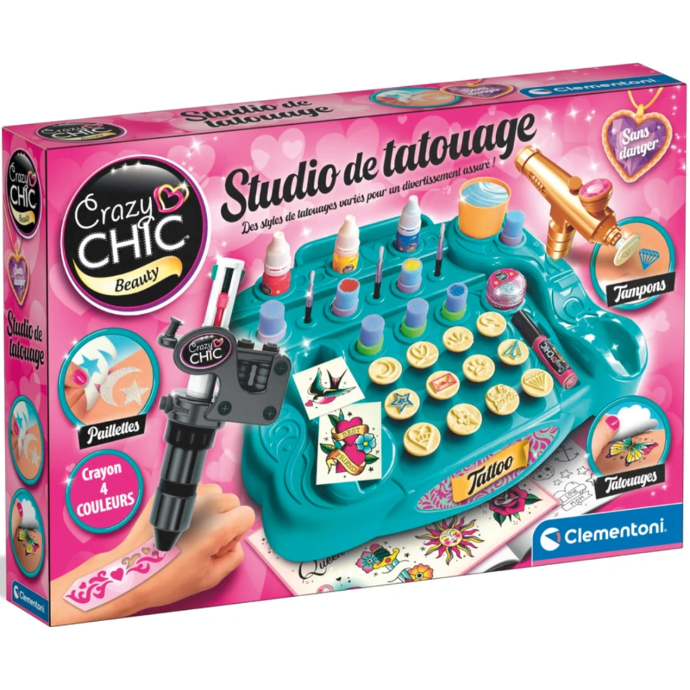 Jeu d’imitation représentant un studio de tatouage où les fillettes de 7 ans et plus peuvent s’amuser à créer leurs propres tatouages - Offre la possibilité de faire les dessins sur la peau à main levée ou à l’aide des pochoirs - Inclut une machine-tampon et différents encres pour faire des motifs colorés - Contient des tatouages transferts, des peintures pour le corps pour colorier les tatouages, des éponges, des applicateurs, des pochoirs, un livre de dessins et de conseils pour créer ses tatouages.