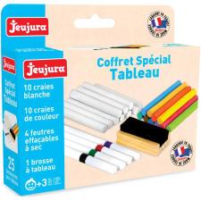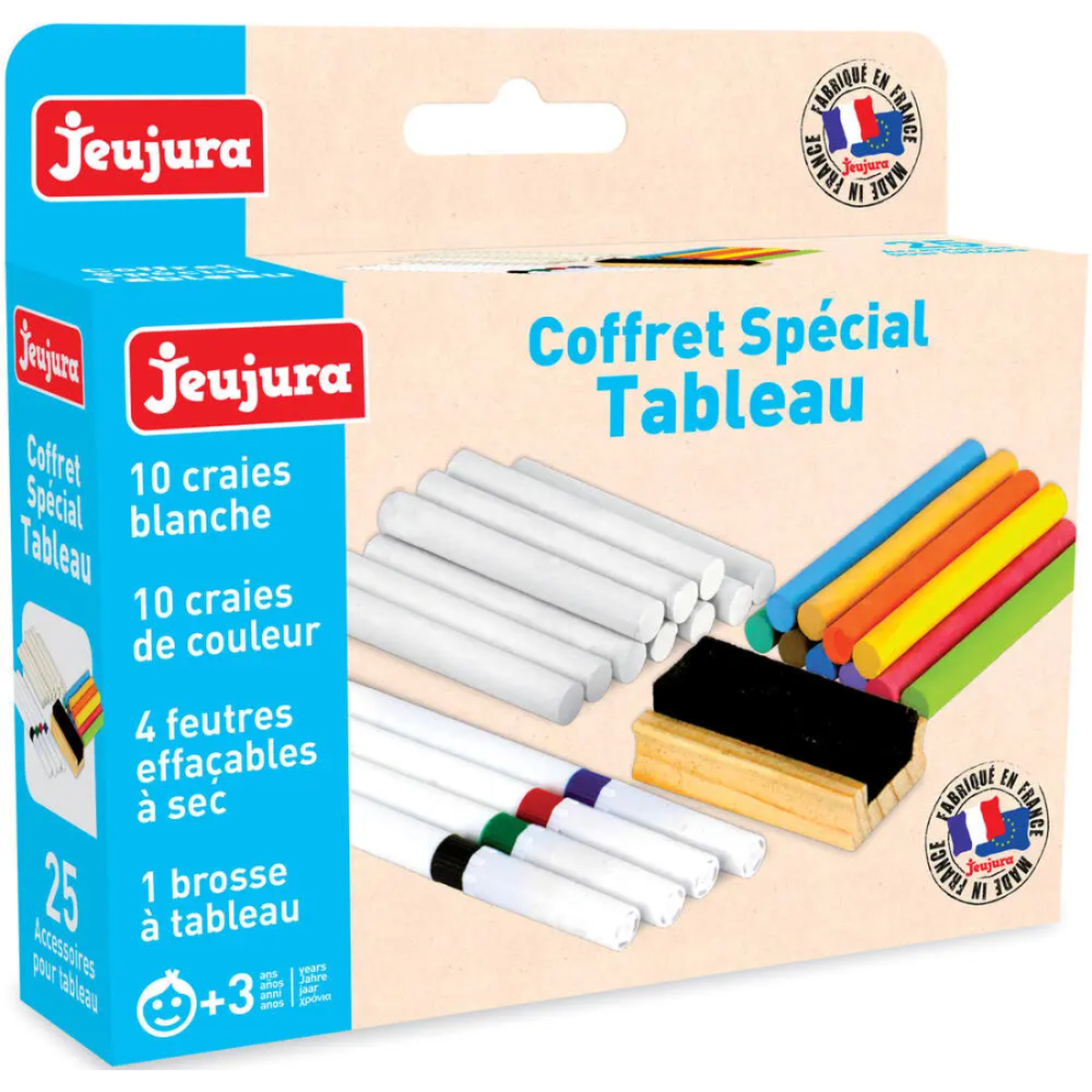 Coffret spécial tableau constitué de 10 craies blanches, 10 craies de couleur, 4 feutres effaçables à sec, 1 brosse à tableau en bois - Fait exactement 4 cm de long, 17 cm de large et 15 cm de haut - Convient pour les types de tableaux - Recommandé pour compléter le kit d’apprentissage des enfants de 3 ans et plus qui apprennent à écrire - Conditionné dans un emballage en carton recyclé - Se transporte facilement lors des déplacements pour permettre à l’enfant de s’exercer à l’écriture où il le souhaite.