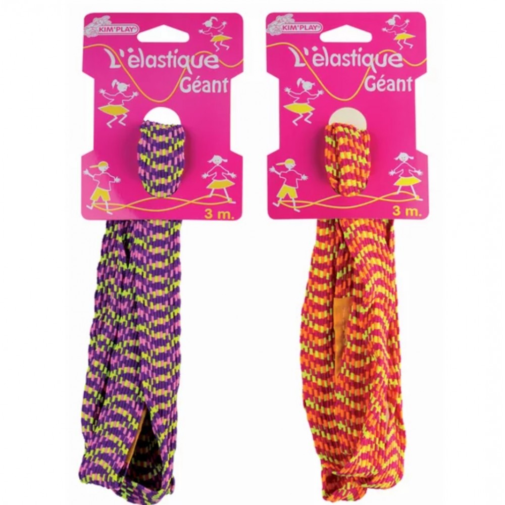Jeu élastique Géant longueur 3m. Jouez à trois : 2 personnes se tiennent face à face et tendent l'élastique à hauteur de leurs chevilles. La troisième personne se positionne au centre et exécute des figures en sautant. Dès que le joueur rate une figure, il est remplacé par un des deux autres joueurs. Pour plus de difficulté, l'élastique peut être monté au niveau des genoux.
