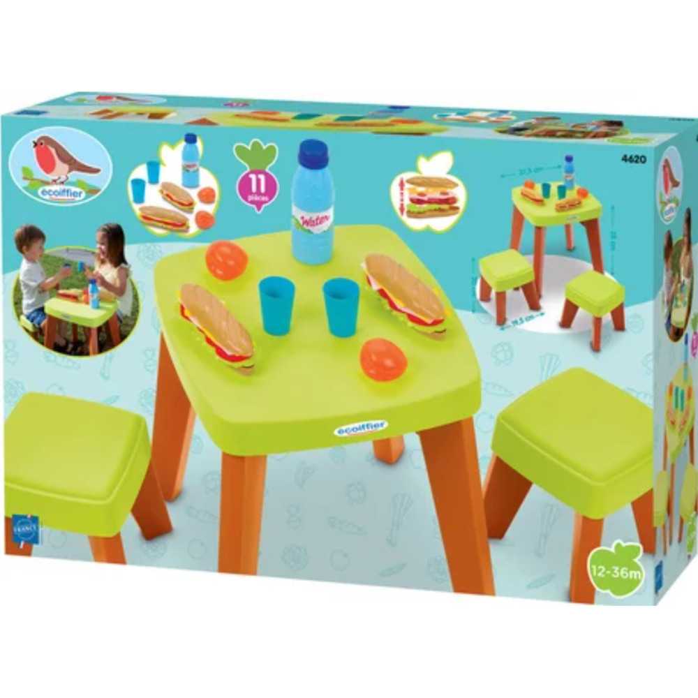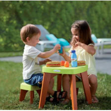 Table pique-nique pour les enfants à partir de 12 mois, équipée de 2 sandwiches, 2 fruits, 2 gobelets 1 bouteille d'eau et de 2 tabourets pour s’installer confortablement à l’intérieur comme à l’extérieur - 11 pcs au total - Hauteur de l'assise : 20 cm - Hauteur de la table : 38 cm - Âge requis : dès 12 mois - Conditionnement du colis : colis normal - Attention - Ne convient pas aux enfants de moins de 18 mois - Longue corde/Longue chaîne - Danger de strangulation.