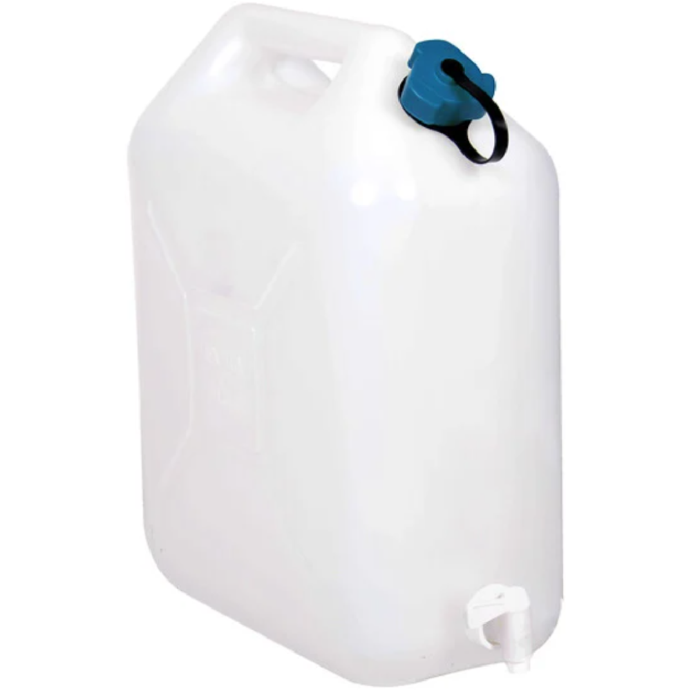 Jerrican alimentaire de couleur blanche proposant une contenance de 20 litres Fabriqué en plastique alimentaire sans Bisphénol (BPA) - Doté d’un robinet et d’un tuyau d’évacuation de 15 cm - Affiche une haute qualité de fabrication avec des détails soigneusement travaillés - Présente une structure solide avec un bouchon à vis et un robinet sur le côté - Dimensions du jerrican : 440 mm de haut, 355 mm de profondeur et 170 mm de long - Adapté pour la planche Colon-net - Présente un dépassement du robinet de 4 cm.