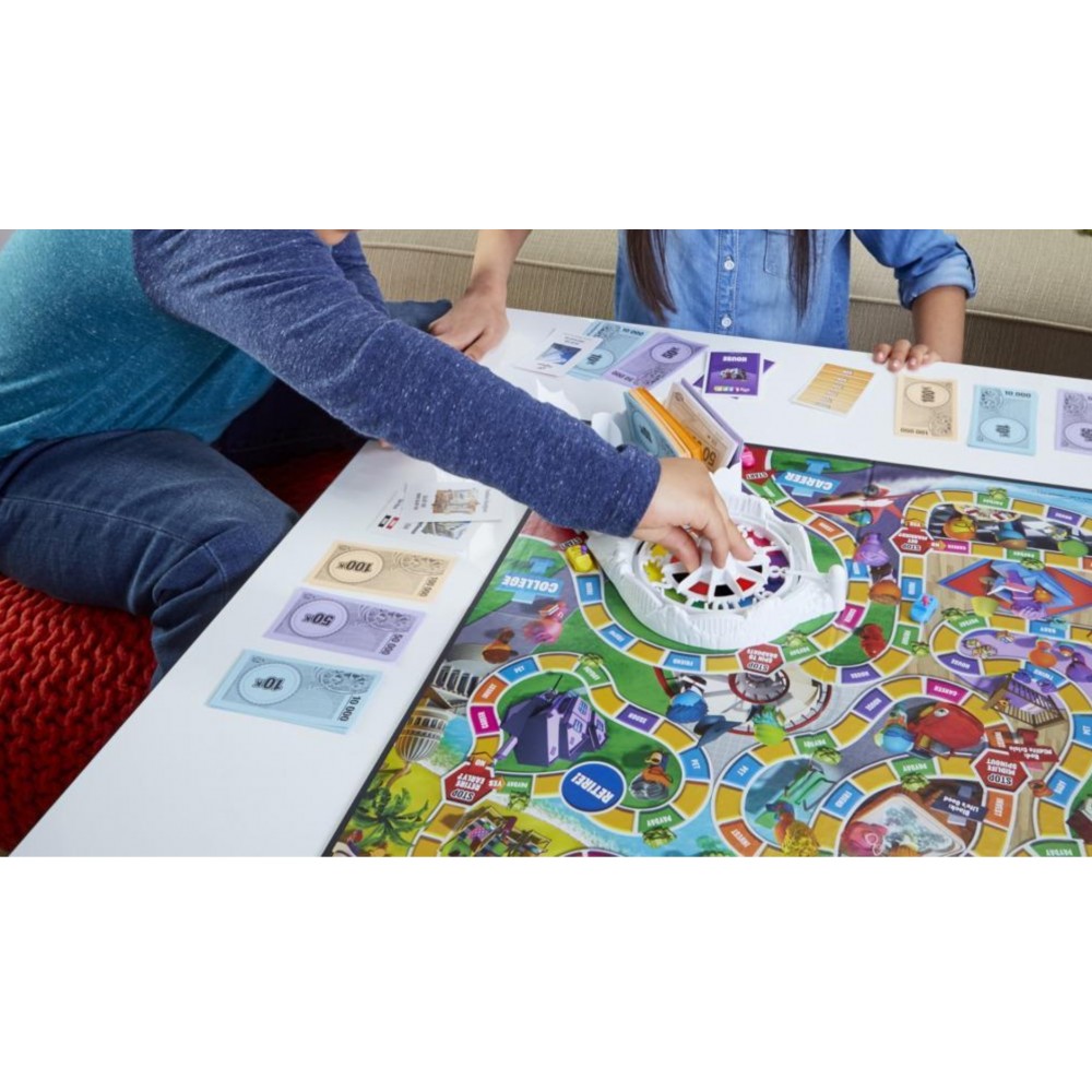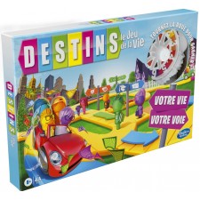 Les joueurs bouclent leur ceinture pour prendre les virages captivants de la vie. Ils peuvent faire monter des pions personnage colorés dans leur voiture et faire tourner la roue pour parcourir le chemin qui les mènera de la case Départ à la case Retraite. Les cases contiennent des étapes majeures de la vie et les joueurs font tourner la roue pour définir leur destin ou choisissent la voie qu'ils suivront. Décideront ils de se marier, de fonder une famille ou de prendre une retraite anticipée ? Les cartes Action permettent aux joueurs de décider comment se dérouleront leurs aventures captivantes. Et les joueurs qui ont le goût du risque pourront investir dans un chiffre du plateau de jeu et obtenir de l'argent chaque fois qu'un joueur obtient ce chiffre à la roue. Peu importe leurs choix, les joueurs devront dépenser judicieusement leur argent, car c'est le joueur le plus riche à la fin de la partie qui sortira vainqueur. Nombre de 2 à 4. Destins Le jeu de la vie est idéal pour les journées à la maison et un jeu d'intérieur amusant pour les enfants (à partir de 8 ans). C'est aussi un super choix pour les soirées de jeux et l'école à la maison. Plateau de jeu avec roue, 90 cartes (55 cartes Action, 20 cartes Carrière, 11 cartes Maison, 4 cartes Investissement), 4 voitures, 36 pions personnage et paquet d'argent. Nombre de joueurs de 2 à 4.