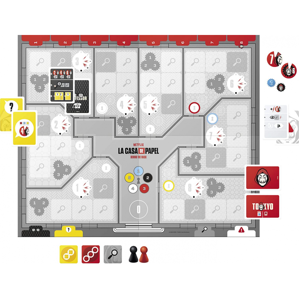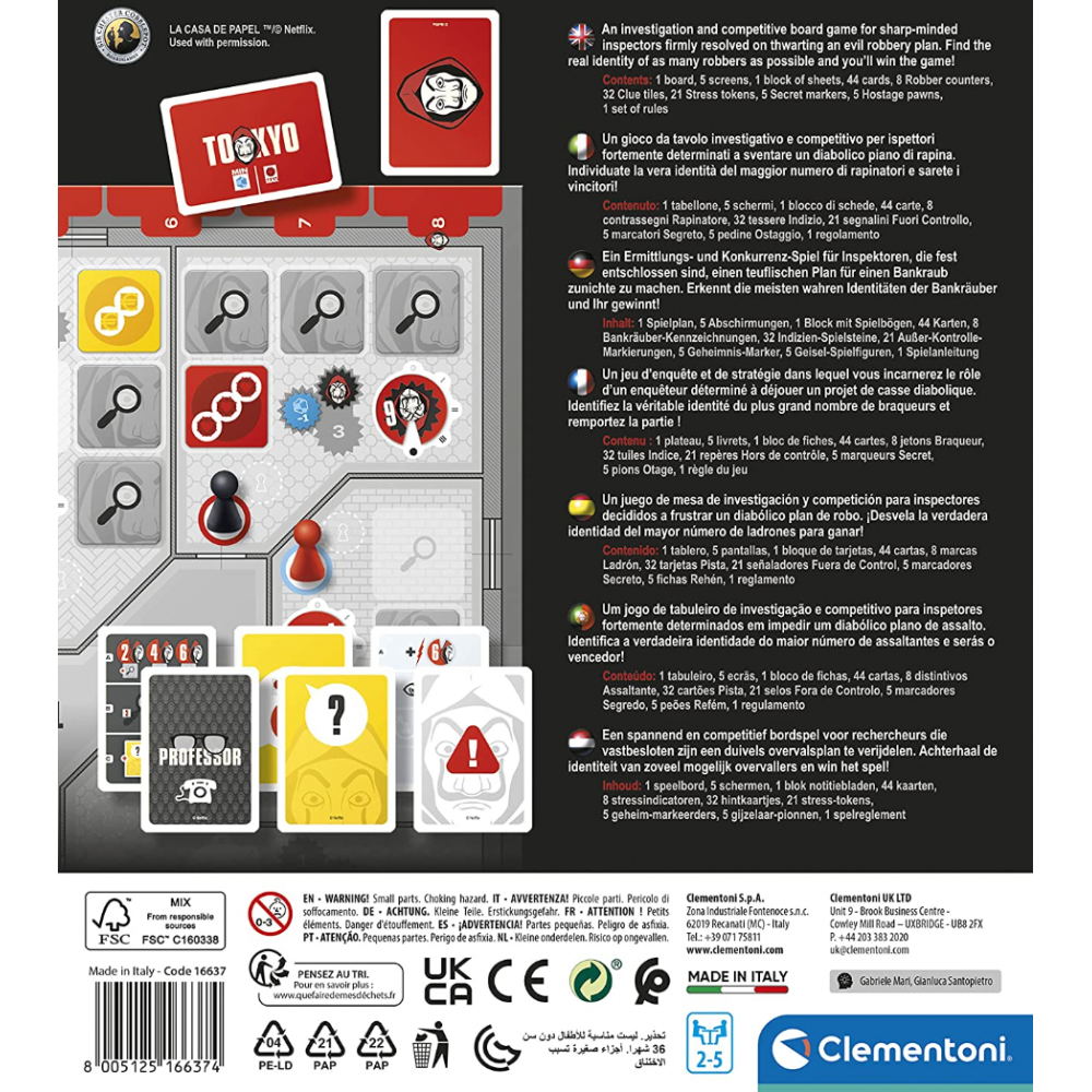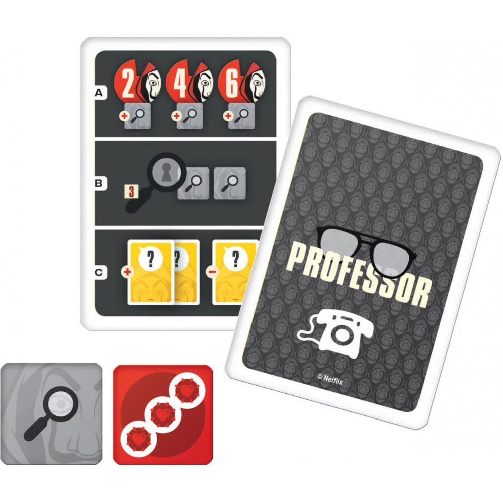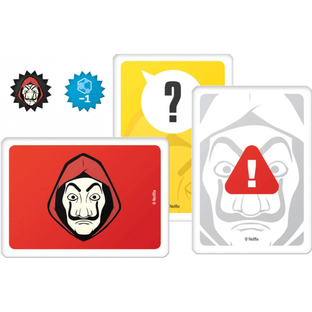 Découvrez le jeu de société de la série télévisée Netflix qui a captivé des millions de téléspectateurs et vivez les aventures et les émotions des personnages de Casa de Papel. Le jeu contient : un plateau de jeu, 4 livrets pour cacher vos notes aux adversaires, 1 bloc de feuilles pour noter les indices, 4 pions Otage et 8 jetons Braqueur. Avec les cartes et les tuiles indice, les joueurs doivent découvrir l'identité des 8 voleurs, en notant les indices et les caractéristiques découvertes au cours de la partie. Un jeu de déduction dans lequel vous devrez enquêter pour découvrir l'identité des voleurs comme un vrai détective ! Un jeu original et passionnant aussi bien pour les fans de la série que pour les non-initiés. Âge requis : dès 12 ans.
