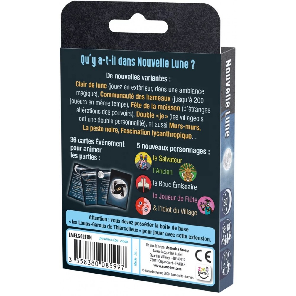 Avec l’extension nouvelle lune, cinq nouveaux personnages font leur apparition : l'idiot du village tellement attachant par sa naïveté, l'ancien ayant victorieusement traversé les terribles épreuves de la vie, le bouc émissaire toujours victime quelle que soit la situation, le salvateur sachant protéger de la morsure des loups-garous et le joueur de flûte cherchant à exercer sa terrible vengeance - Dès 9 ans.