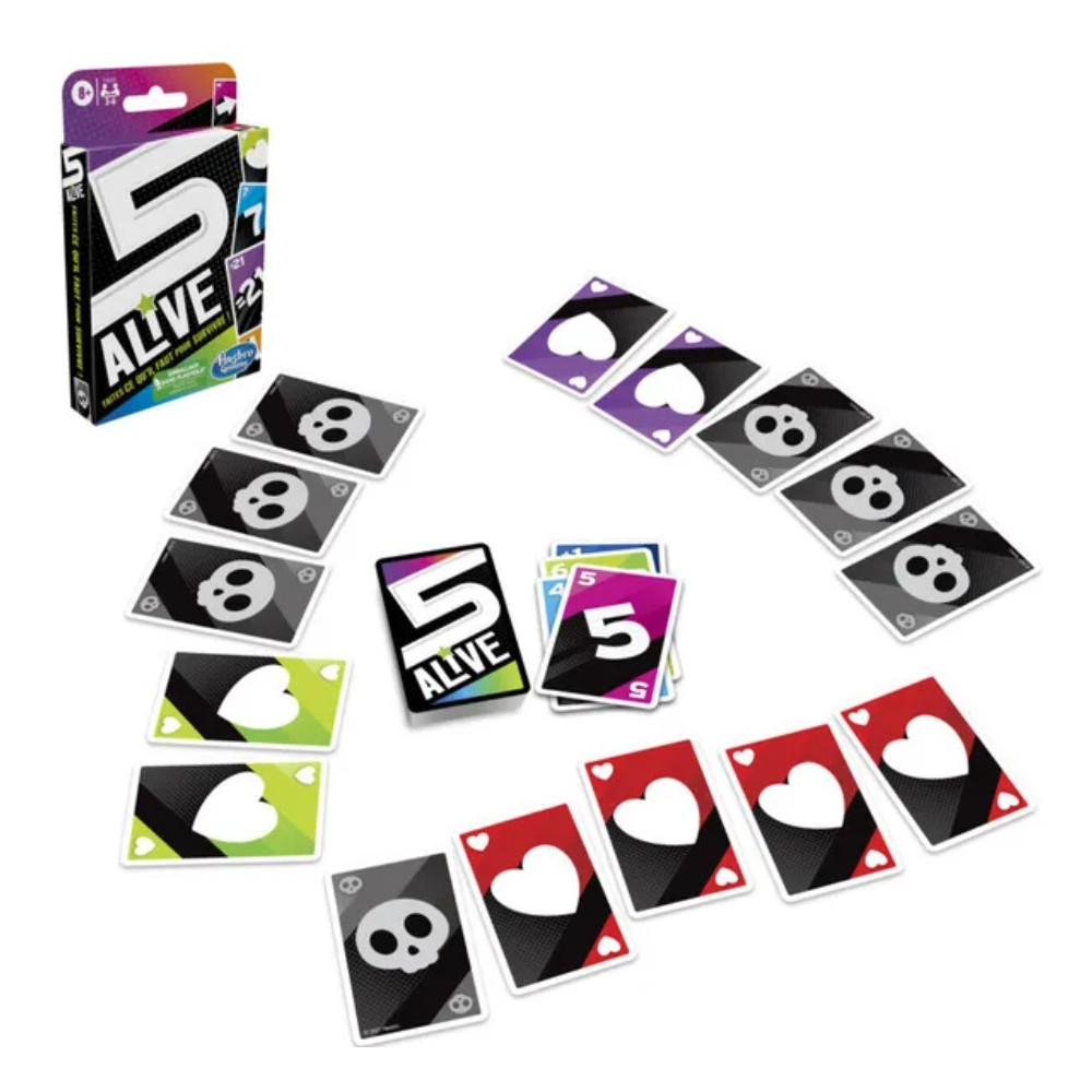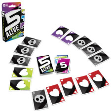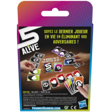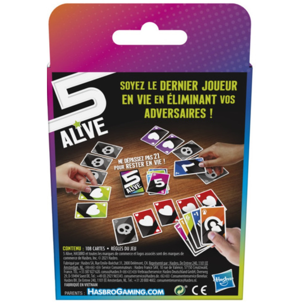 Dans ce jeu de société Five Alive, chaque joueur débute la partie avec 5 vies. Chaque carte est numérotée et possède une valeur de base. Au cours de la partie, les joueurs prennent des risques, jouent avec stratégie et tentent de saboter les plans de leurs adversaires pour leur faire perdre des vies. Mais attention, ce jeu contient des cartes Joker. Celles-ci sont imprévisibles et peuvent permettre aux joueurs d'éviter de perdre une vie, ou elles en font perdre une à l'un des adversaires ! Si un joueur dépasse 21, il devra retourner une carte vie et perdra un point. La partie se poursuit jusqu'à ce qu'il ne reste qu'un seul joueur qui remporte alors la partie ! Les joueurs peuvent varier les parties avec les différentes versions : La fin en mort subite pour une partie accélérée, ou bien le jeu en équipe. Five Alive est idéal pour des parties de jeu en famille ou entre amis. Le principe du jeu est simple et facile à comprendre. Ce jeu de cartes rapide est donc adapté aux enfants, dès 8 ans. Pratique, il est facile à transporter et il est idéal comme jeu de voyage. De 2 à 6 joueurs. L'emballage de ce jeu est sans plastique (sauf le ruban adhésif et la colle).Contient : 108 cartes et les règles du jeu.
