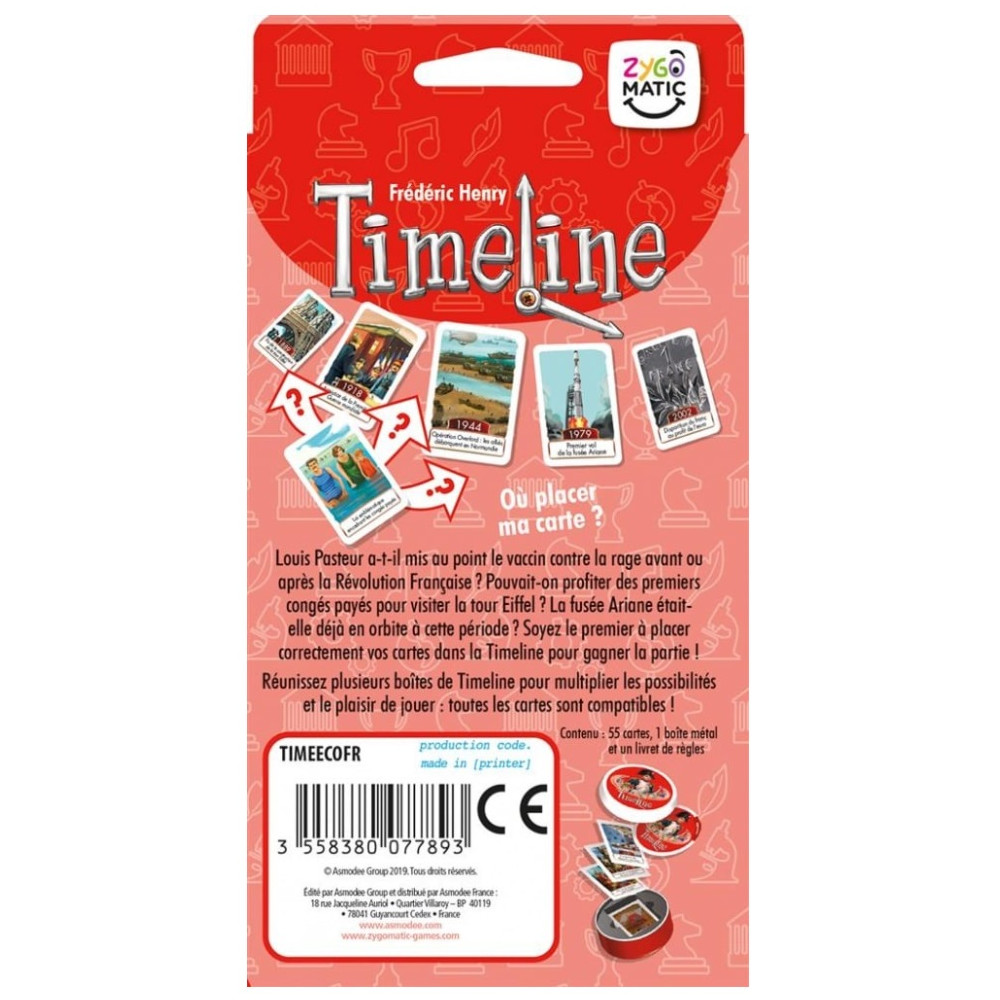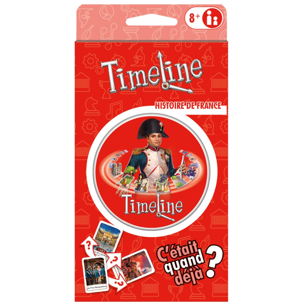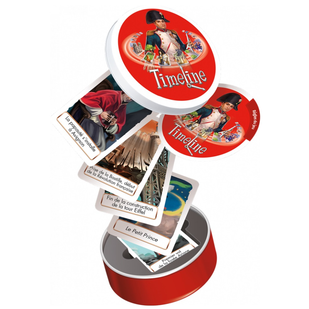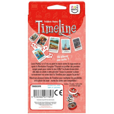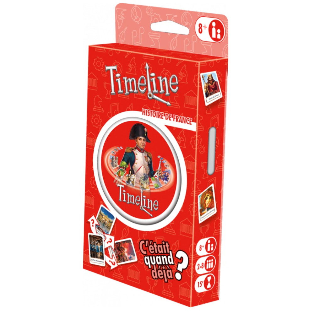 S’il estime que son événement s’est déroulé après, il place sa carte à droite de la carte initiale. La carte du joueur est alors retournée, face date visible. S’il a raison, elle reste en place. Sinon, il défausse sa carte et doit en piocher une autre pour la remplacer. La partie continue dans le sens des aiguilles d’une montre. Plus il y a de cartes placées, plus il est difficile d’en poser de nouvelles sans se tromper ! Si à la fin d’un tour, un seul joueur n’a plus de cartes, ce dernier gagne la partie. Cette version propose des cartes sur le thème de l'Histoire de la France. Quand a commencé la construction de Notre-Dame de Paris?? Quand Louis XIV s’est-il installé à Versailles?? Et Astérix le Gaulois, c’était quand déjà?? Toutes les versions de Timeline sont compatibles entre elles.