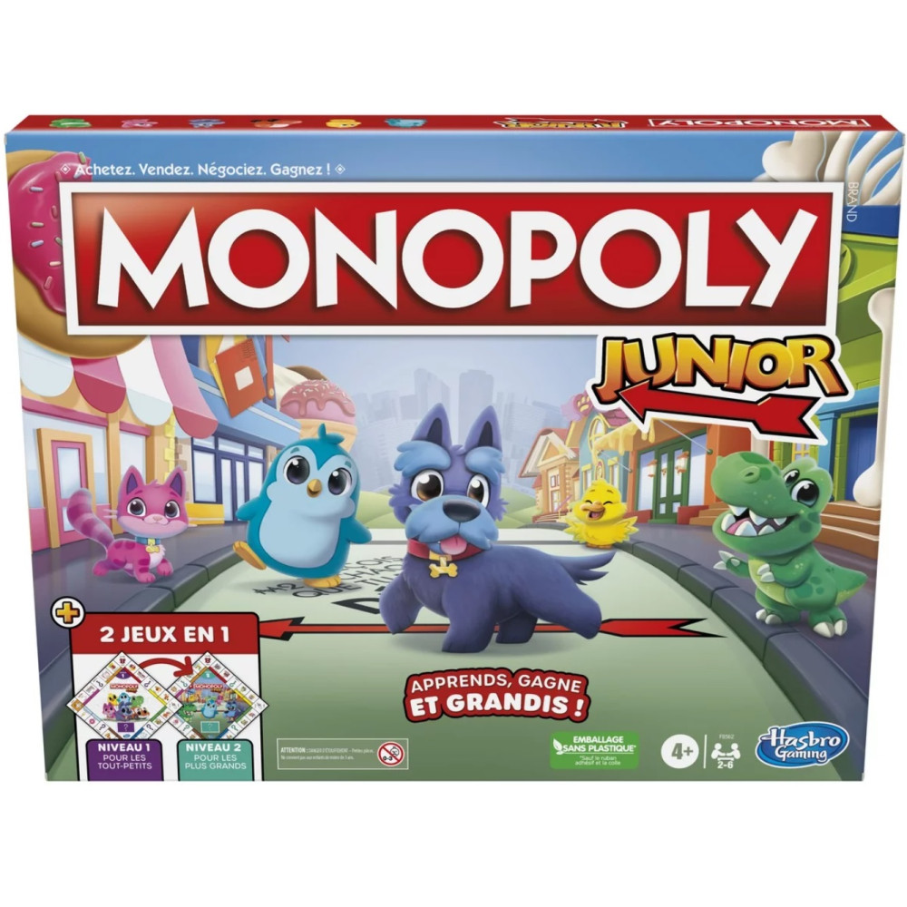 Prêt à passer au niveau supérieur ? Il suffit de retourner le plateau pour découvrir le niveau 2, recommandé pour les joueurs à partir de 6 ans, qui se concentre sur la lecture et les calculs simples - Les joueurs peuvent s'arrêter sur des lieux conçus pour les enfants, tout en achetant des propriétés, en faisant payer des loyers et en découvrant leur fortune - Le joueur le plus riche gagne - Chaque niveau inclut sa propre liasse de billets Monopoly, ses cartes et ses règles - Les deux niveaux incluent 6 pions adorables : le Pingouin, la Voiture, le Canard, Scottie, Hazel et Petit Dino - Pour 2 à 6 joueurs.