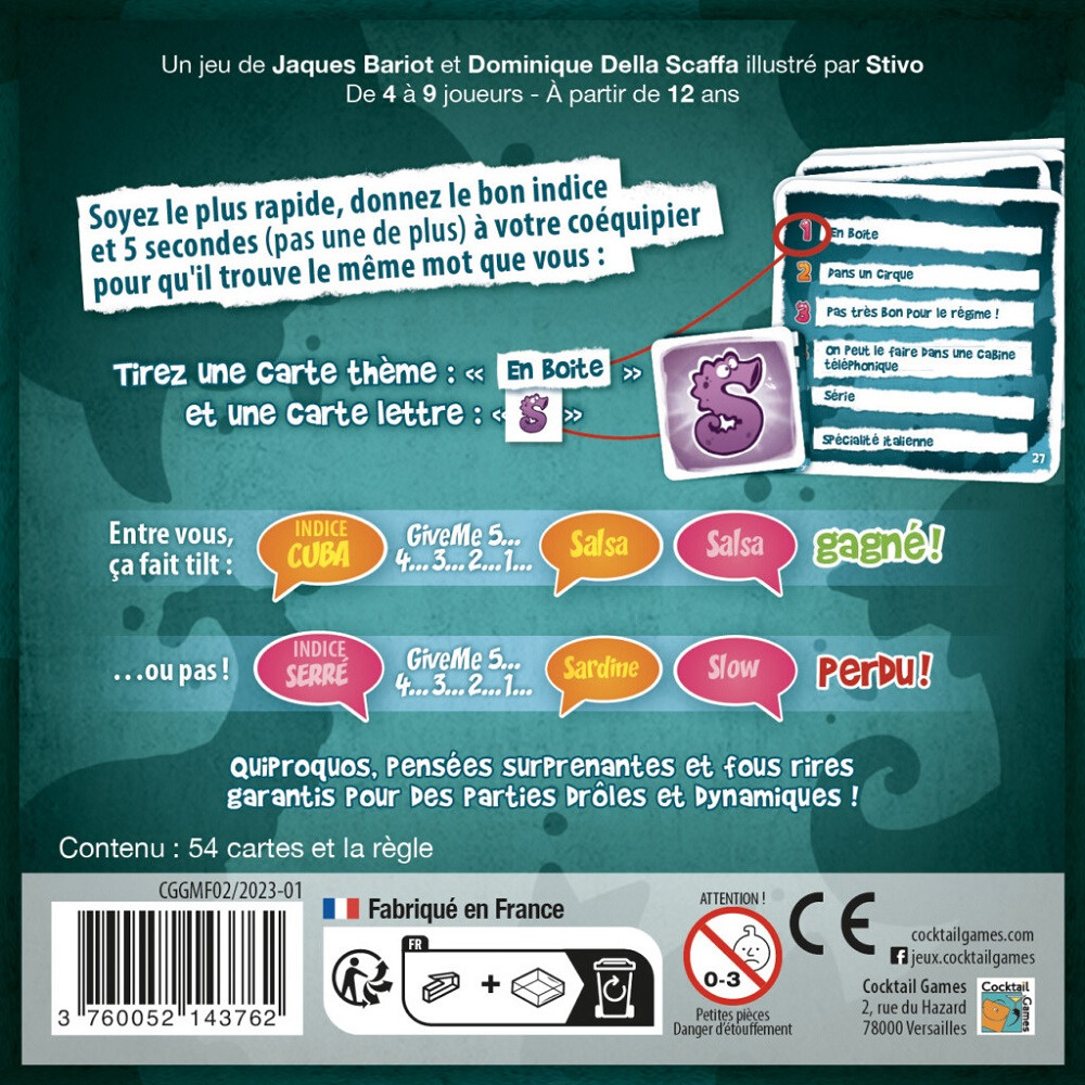 Inventez un nom aux personnages au fur et à mesure de leur apparition : Mister Melon ? Tronche de cake ? Ce que vous voulez ! Mais quand un personnage revient, souvenez-vous de son nom et criez-le en premier ! Un jeu très simple qui encourage la créativité et l’humour ! Nombre de joueurs : 2 à 7 joueurs - Durée de jeu : 15 minutes - Dès 6 ans.