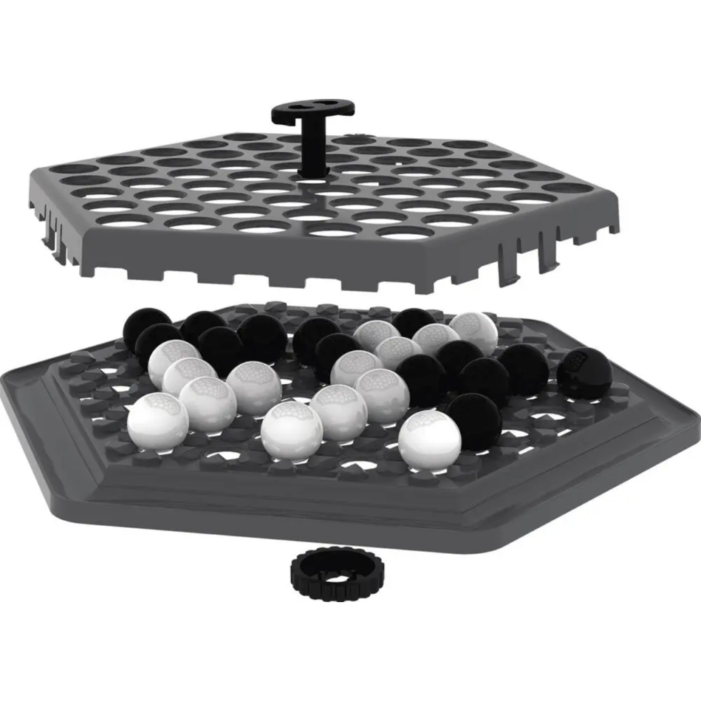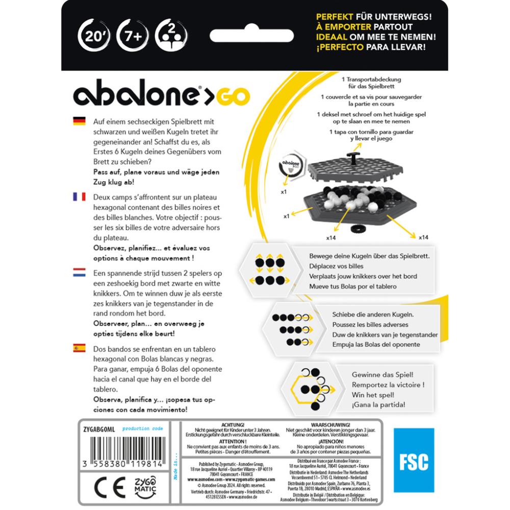 Jeu Abalone Go représentant deux camps qui s’affrontent sur un plateau hexagonal contenant des billes noires et blanches - Conçu pour stimuler la réflexion des joueurs - Fourni avec plusieurs accessoires dont 1 plateau, 1 couvercle, 1 vis, 1 boulon, 14 billes blanches, 14 billes noires et 1 livret de règles - Exige au moins 2 joueurs - Offre des parties de jeu durant entre 15 et 30 minutes - Recommandé pour les enfants dès l’âge de 7 ans.