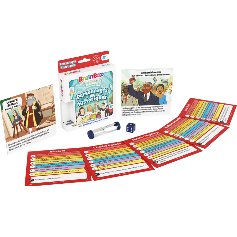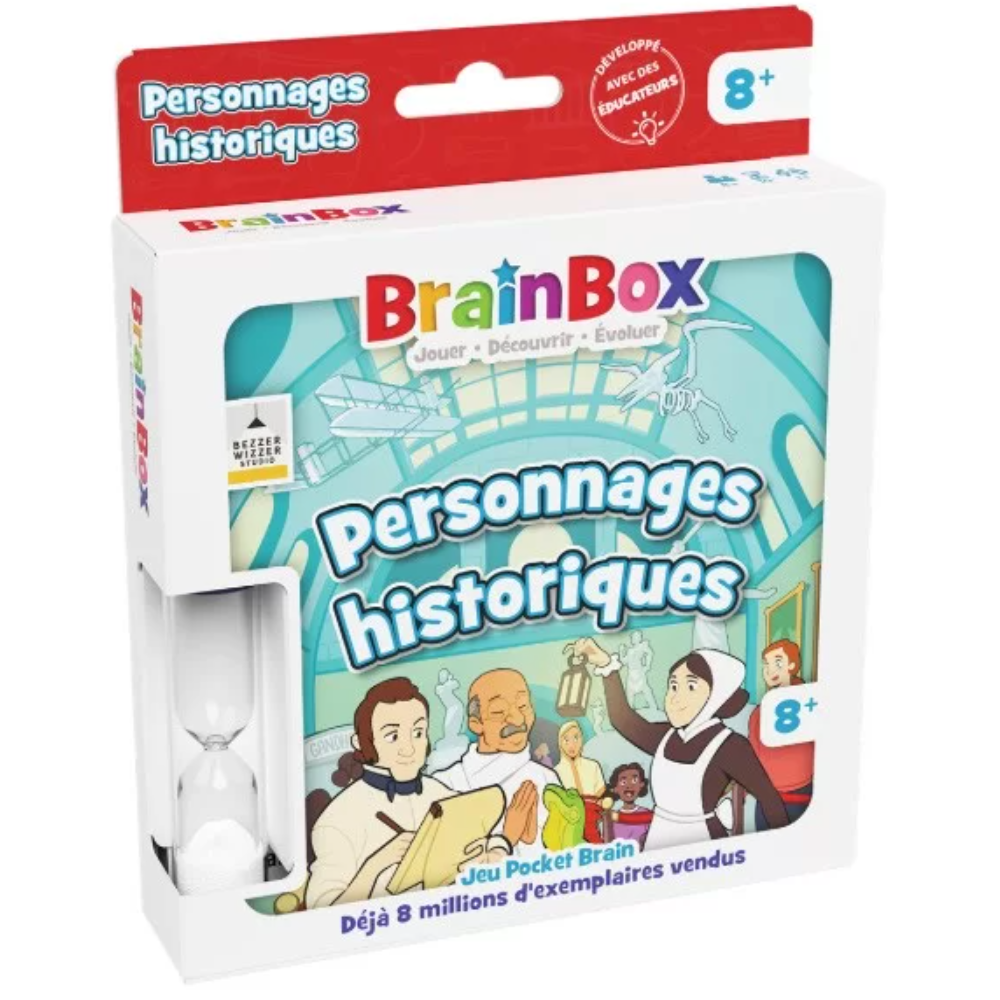 Brainbox Pocket personnages historiques conçu en format de poche contenant 150 questions avec des illustrations qui mettent en image des découvertes toujours plus passionnantes - Recommandé pour travailler le sens de l’observation et la mémoire des adultes et des plus jeunes - Contenu dans un pack de 100 grammes mesurant 11.7 cm de haut, 2.5 cm de large et 11.7 cm de long.