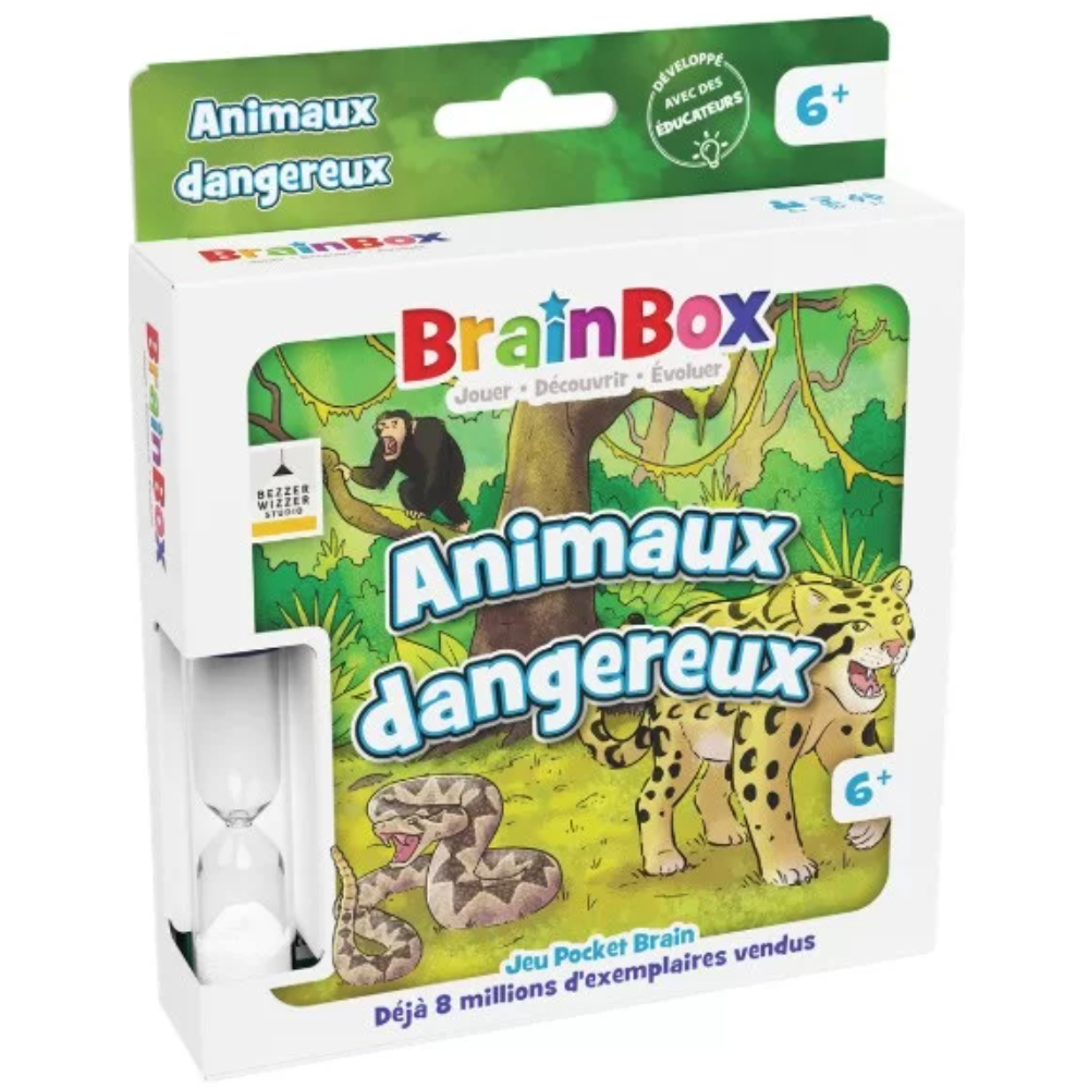 Brainbox Pocket animaux dangereux à jouer en famille ou entre amis - Conditionné en format de poche pour un transport et un rangement aisés - Constitué de 150 questions accompagnées d’illustrations qui mettent en image des découvertes suscitant la curiosité de joueurs - Utilise un principe de jeu simple interpellant la mémoire et le sens de l’observation du joueur - Conçu en français.