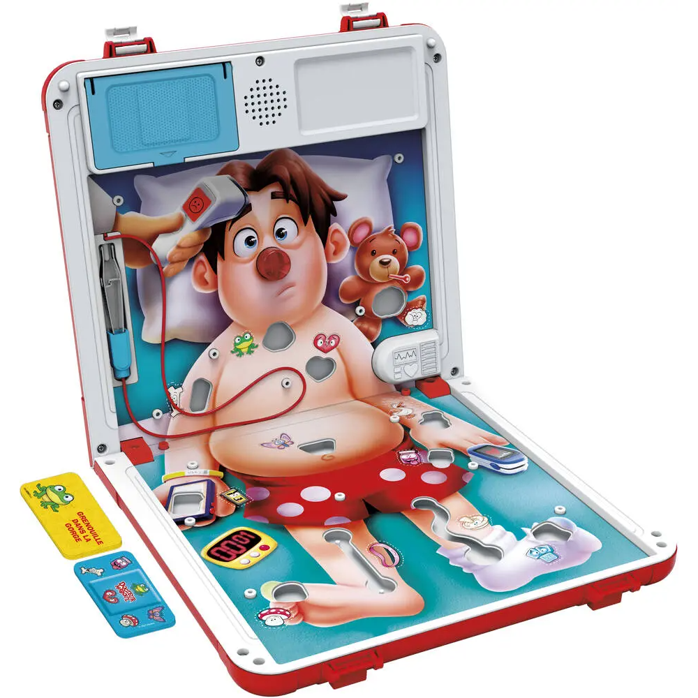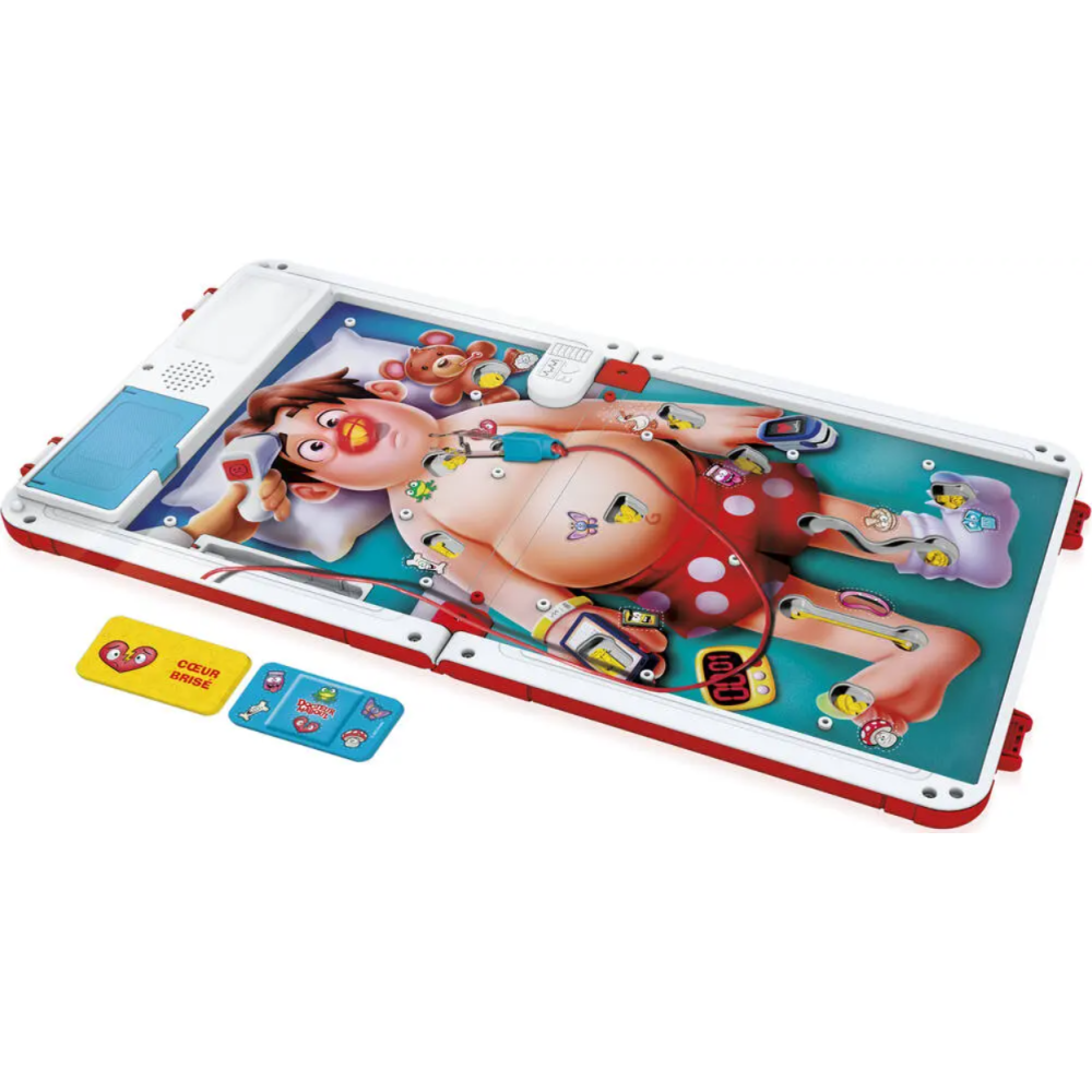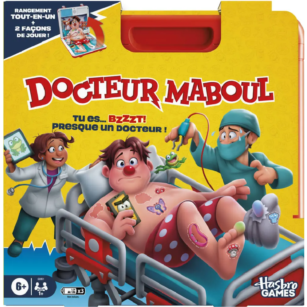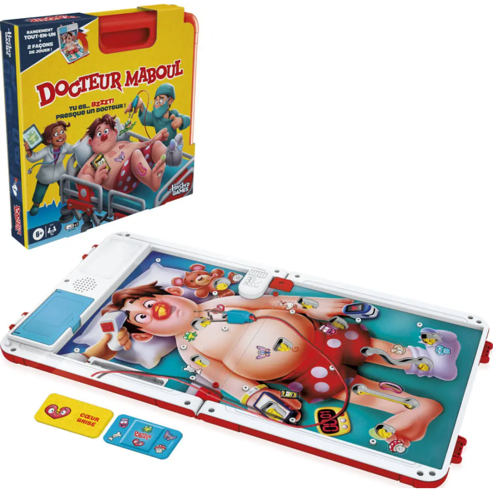 Jeu de plateau Docteur maboul proposant deux modes de jeu : mode classique ou mode urgence - Proposé dans une mallette de transport avec rangement tout-en-un ce qui en fait un jeu de voyage pour enfants idéal pour jouer n'importe où, n'importe quand - Inclut 1 plateau de jeu et pince attachée, 12 bobos en plastique (élastique compris), 12 cartes et règles du jeu - Jouable seul ou en groupe ( jusqu’à 10 joueurs) dès l’âge de 6 ans - Repose sur un principe simple consistant à piocher une carte et retirer la pièce indiqué sans toucher les rebords métalliques - Recommandé pour aider les petits passionnés de médecine à se familiariser à l’univers médical - Fonctionne avec 3 piles LR6 non fournies.