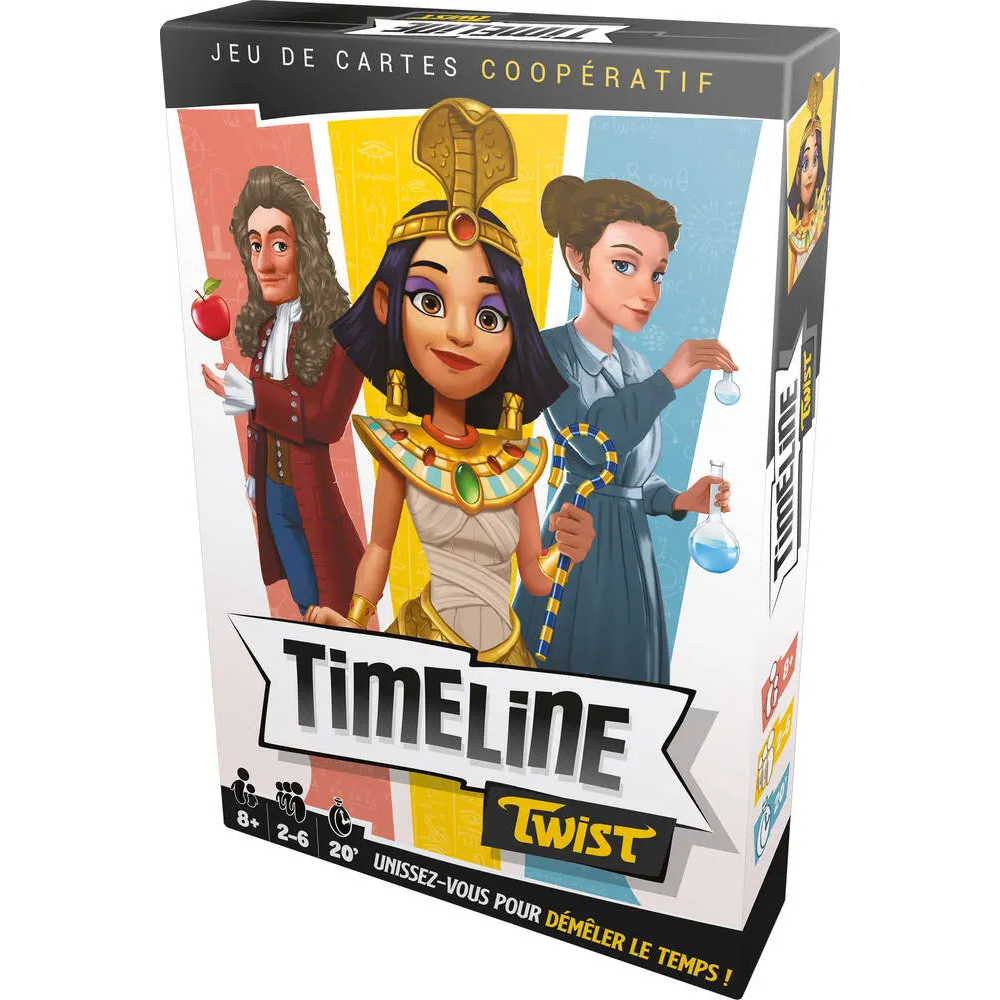Jeu de cartes coopératif Timeline twist pour les 8ans et plus - Idéal pour se détendre en famille - Permet jusqu'à 6 joueurs - Développe l'esprit d'équipe, d'analyse et optimise la coordination et la communication entre les joueurs d'une même équipe - Contient 165 cartes et des règles de jeu.