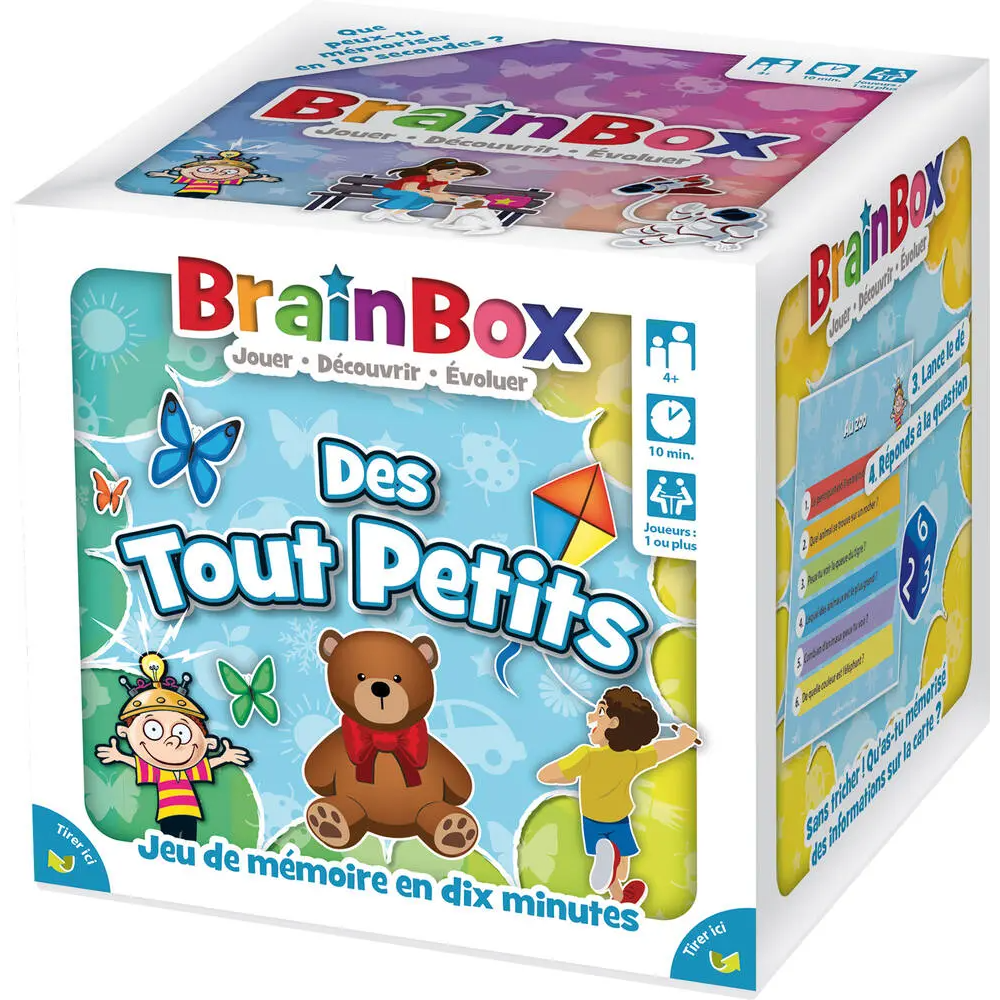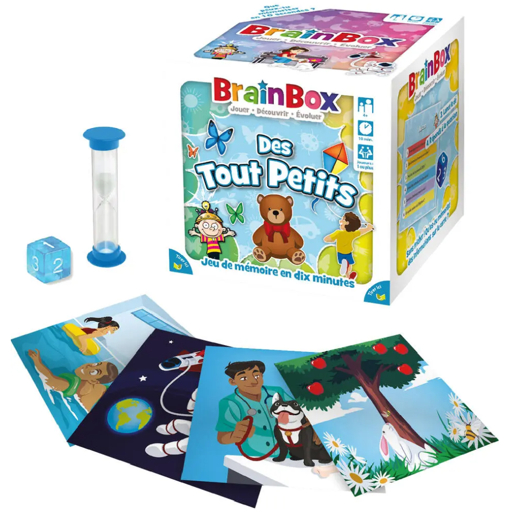 Jeu éducatif Brainbox élaboré pour aider l’enfant à apprendre tout en s’amusant - Affiche un design hyper coloré parfait pour éveiller l’intérêt des enfants de 4 ans et plus - Repose sur un principe simple et facile à comprendre : le premier joueur prend une carte dans la boite et retourner le sablier ; il dispose alors de 10 secondes pour mémoriser les images afin de pouvoir répondre à la question qui lui sera posée - Convient pour au moins 2 joueurs - Fourni dans une boîte de jeu carré de 12 cm de côté contenant 55 cartes, un sablier, un dé et la règle de jeu.