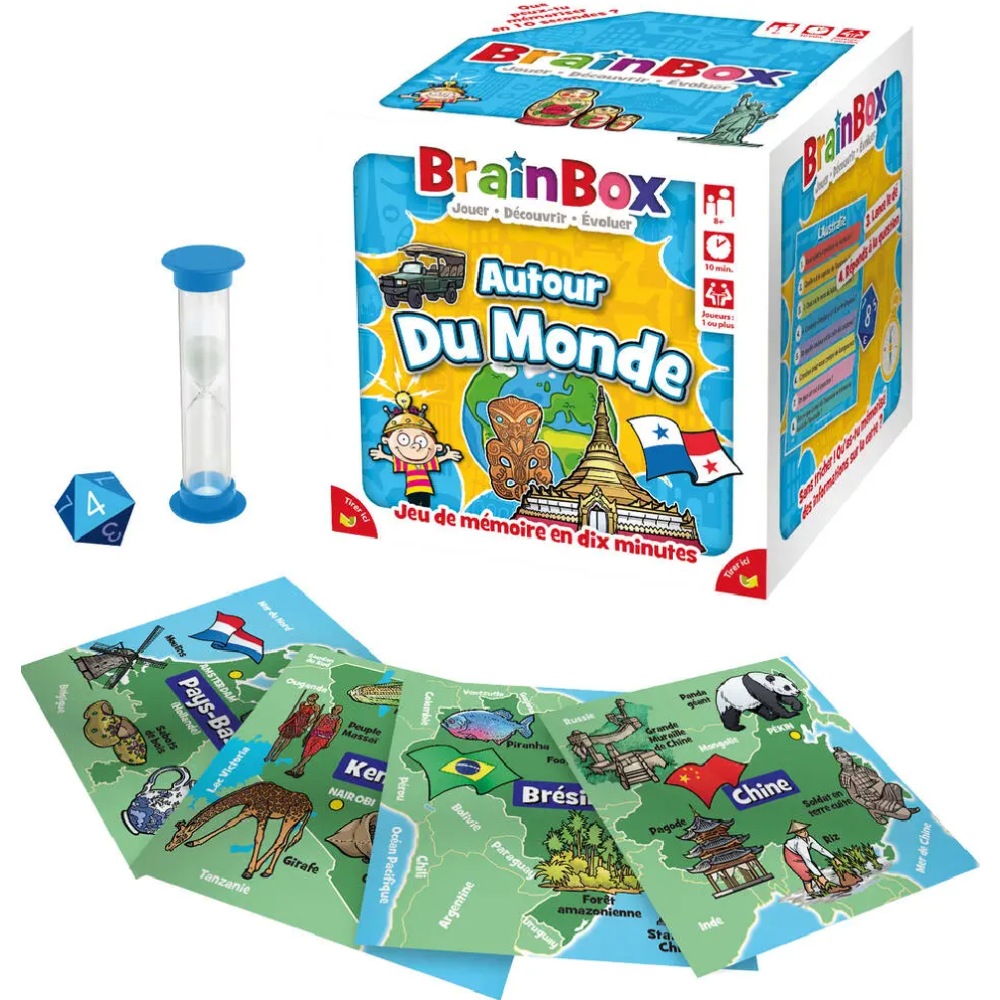 Jeu de mémoire et d’ambiance Asmodee Brainbox voyage autour du monde proposé dans une boite carrée de 12 cm de côté - Constitué de 41 à 72 cartes illustrées, 1 sablier, 1 dé et une règle de jeu - A jouer seul ou à plusieurs - Convient pour les enfants âgés de 8 ans ou plus - Stimule la réflexion et les capacités de compréhension du joueur - Arbore des couleurs vivantes et attractives qui incitent au jeu et assurent des séances de questions -réponses intéressantes - Développe les connaissances des joueurs sur divers pays du monde et leurs spécificités.