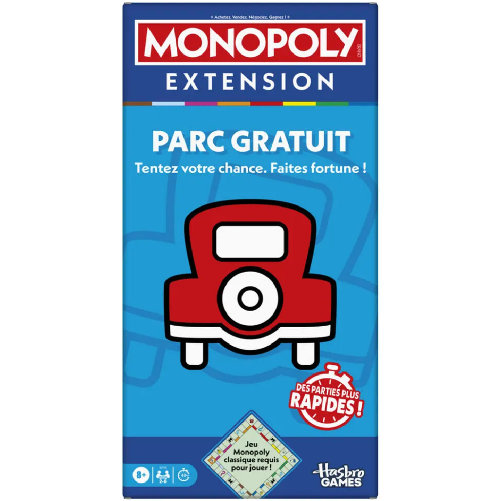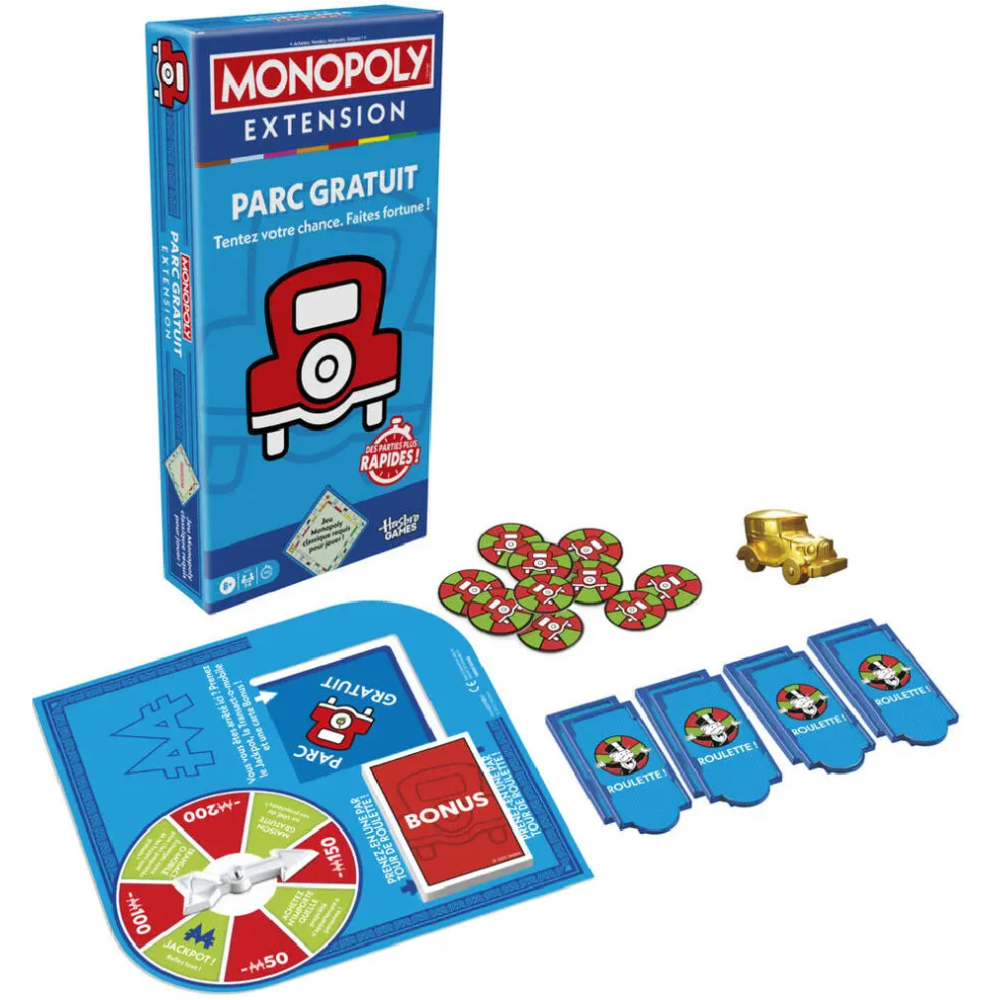 Monopoly extension parc gratuit, une addition captivante pour enrichir votre expérience de jeu - Vous plonge dans l'univers des jeux de société avec extension en ajoutant de la profondeur et du plaisir à vos soirées en famille ou entre amis - S'intègre facilement au plateau de jeu classique du Monopoly et transforme juste la case Parc gratuit en cagnotte - Offre la possibilité d'obtenir des propriétés gratuitement en piochant des cartes bonus - Contient: 1 flèche de roulette Parc gratuit avec base, 6 pinces de case roulette, 1 pion Transact-o-mobile, 20 jetons roulette, 32 cartes bonus Parc gratuit, 8 cartes Résumé des règles et 1 règle d'extension - Recommandé à partir de 8 ans.