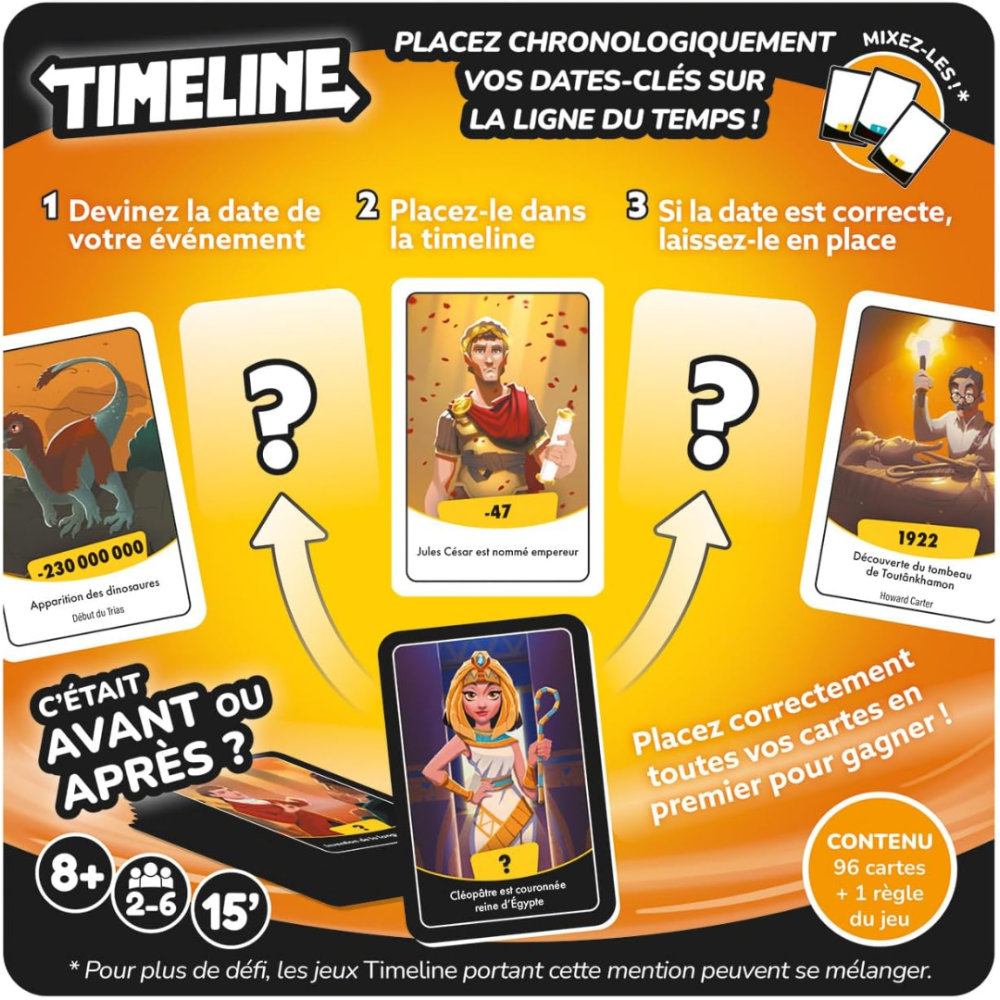 Jeu de société Timeline idéal pour les amateurs d'histoire, les familles et les amis à la recherche d'une expérience de jeu divertissante et éducative - Se joue en illustrant des évènements historiques - Permet de tester ses connaissances et de défier des amis dans une course contre le temps - Peut se jouer à 2 ou à 6 joueurs - Contient 96 cartes et 1 livret de règles - Pour y jouer il faut avoir au moins 8 ans - Concept simple et ludique - Jeu évolutif - Idéal pour des parties de jeu à la fois rapides et instructives.