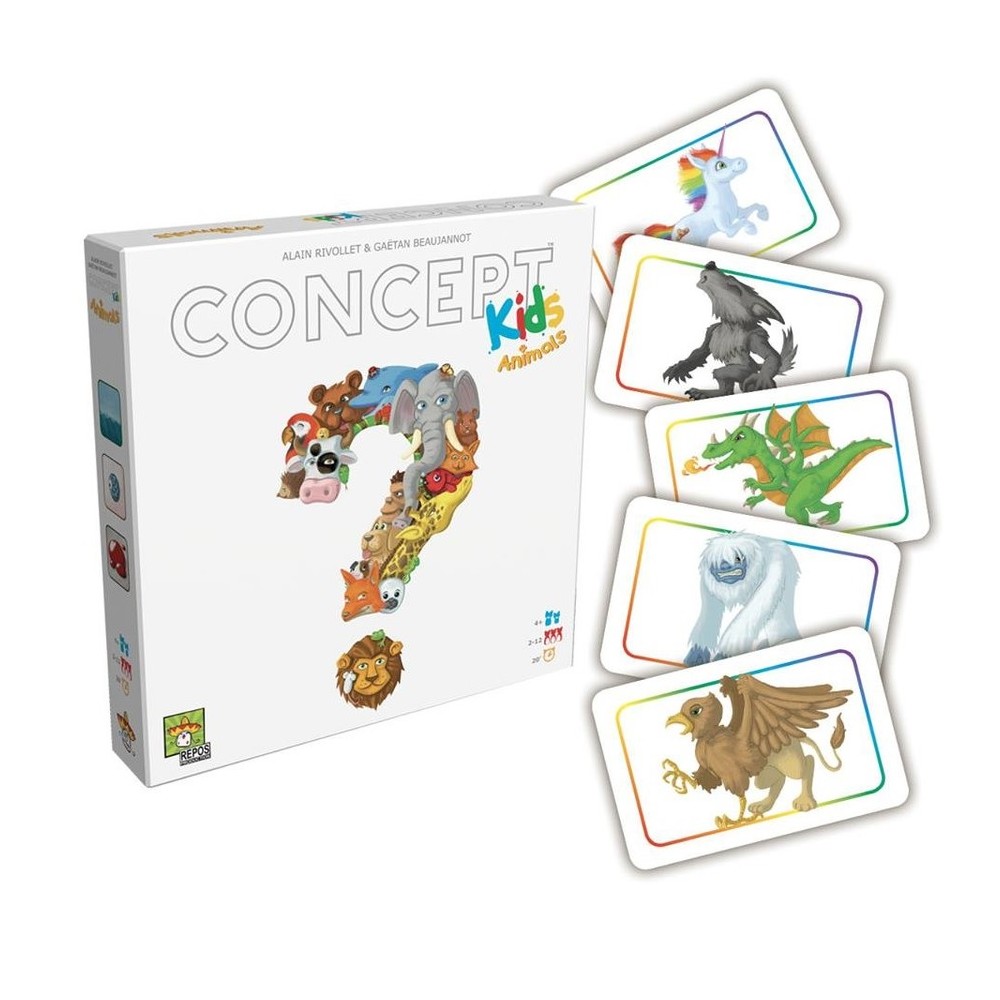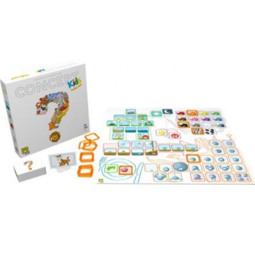 Concept Kids Animaux est une version coopérative du jeu Concept adaptée aux enfants qui ne savent pas encore lire. Chacun a? leur tour, les enfants tentent de faire deviner un animal en posant des pions sur les icônes illustrées du plateau de jeu. Par ce moyen, l’enfant indique une caractéristique de l’animal a? trouver. Piochez 12 cartes et tentez d’en deviner autant que possible pour avoir le plus de points tous ensemble ! Concept Kids Animaux propose 110 animaux à deviner répartis en deux niveaux de difficulté. Magnifiquement illustré par Éric Azagury, ce jeu de communication pour les enfants leur permettra de découvrir le monde animal de façon rigolote et novatrice.