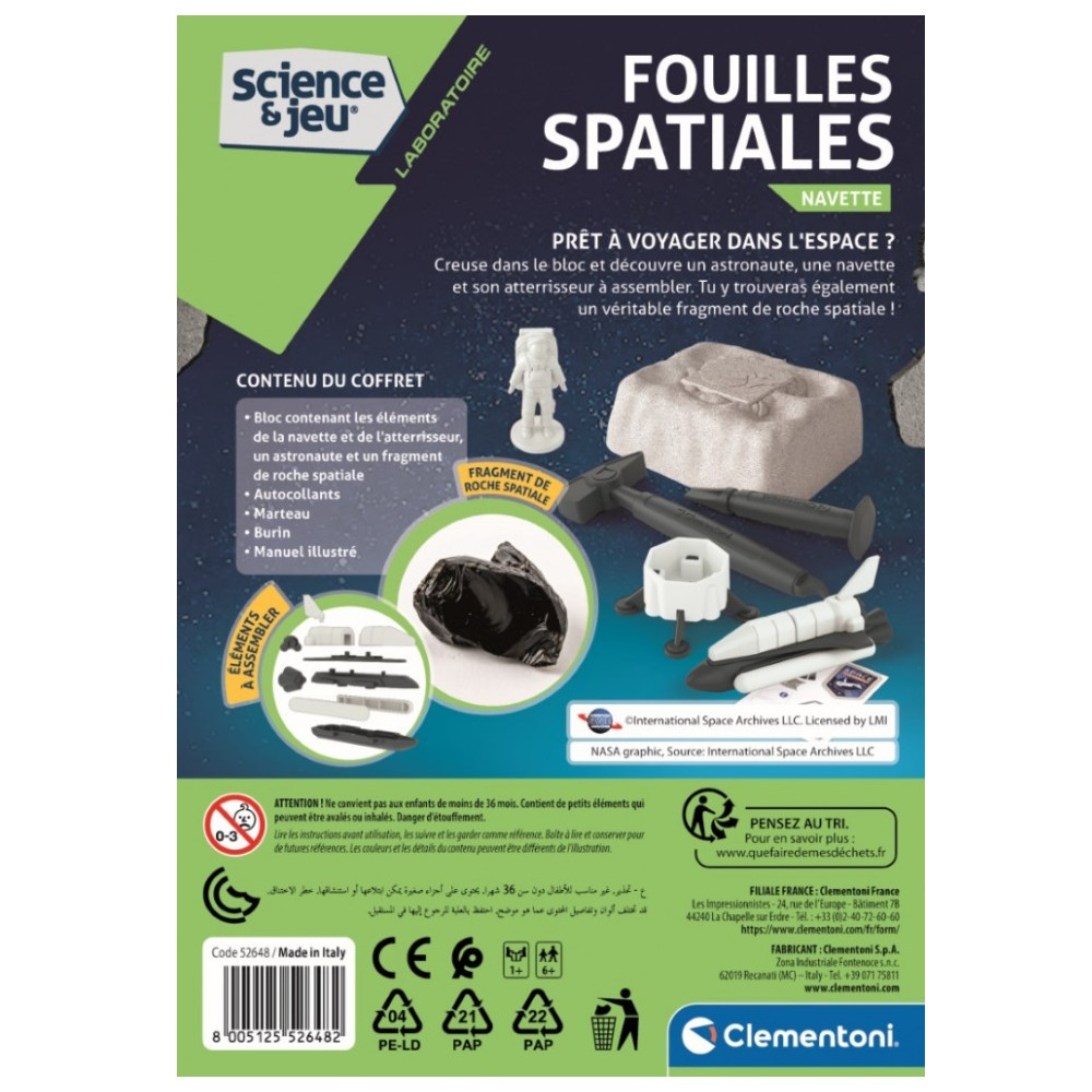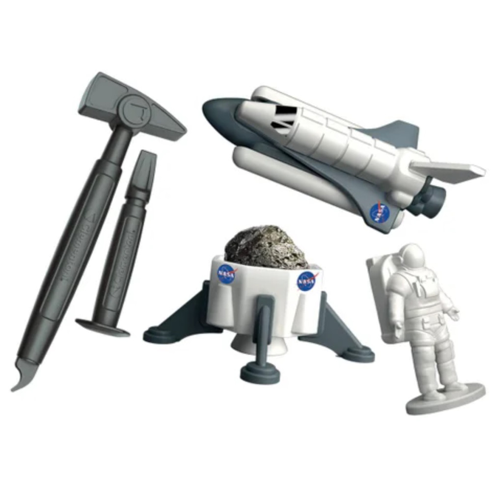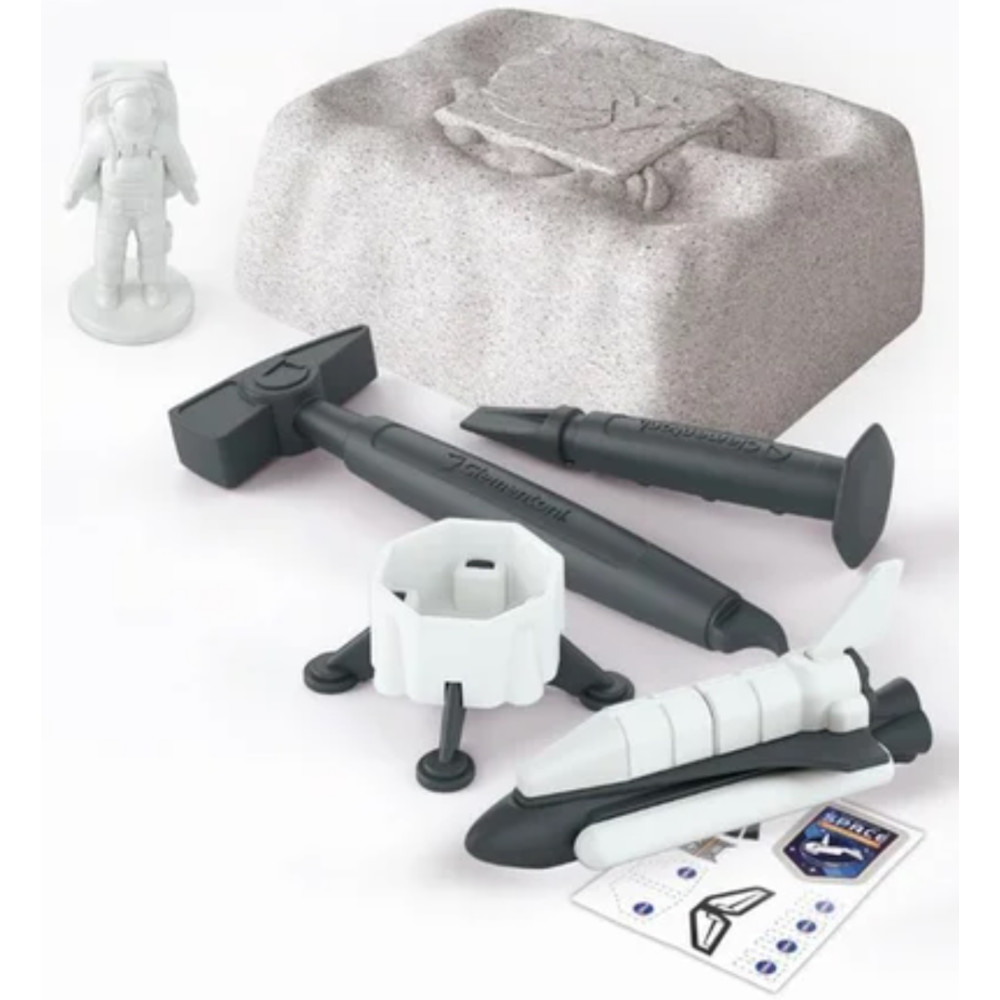 Lance-toi dans une mission spatiale incroyable comme un véritable astronaute ! Le jeu contient une brique de plâtre à creuser à l'intérieur de laquelle sont dissimulés une navette à reconstituer, un lander et un personnage de cosmonaute. Creuse la brique à l'aide du marteau et du scalpel et récupère également un véritable fragment de roche météoritique ! Assemble la navette et tiens-toi prêt à partir pour de nouvelles aventures et explorations du cosmos !