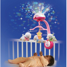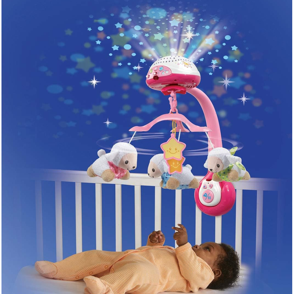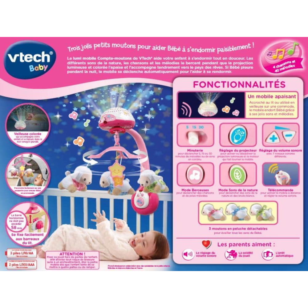Lumi mobile de couleur rose convient pour une idée cadeau ou pour faire plaisir aux tout-petits de 0 à 3 ans - Dispose de 3 petits moutons accrochés au bout de petites ficelles tournoyantes qui aident l’enfant à trouver le sommeil calmement - Intègre des chansons et mélodies de la nature qui bercent bébé jusqu’à l’endormissement - Projette une lumière douce et colorée qui l’amène tout doucement à s’endormir - Fabriqué avec une télécommande et un bouton lumineux qui permettent de contrôler le mobile à distance - A monter sur le bord du berceau - Poids de l’article 1.3 kg.