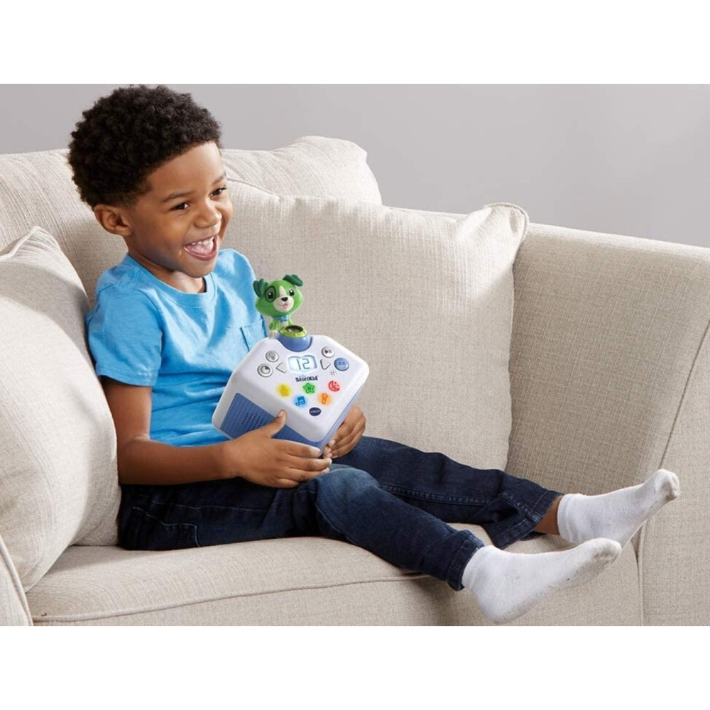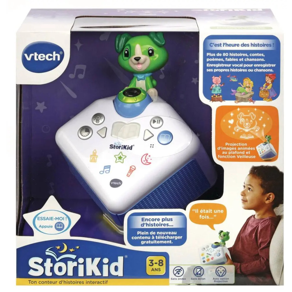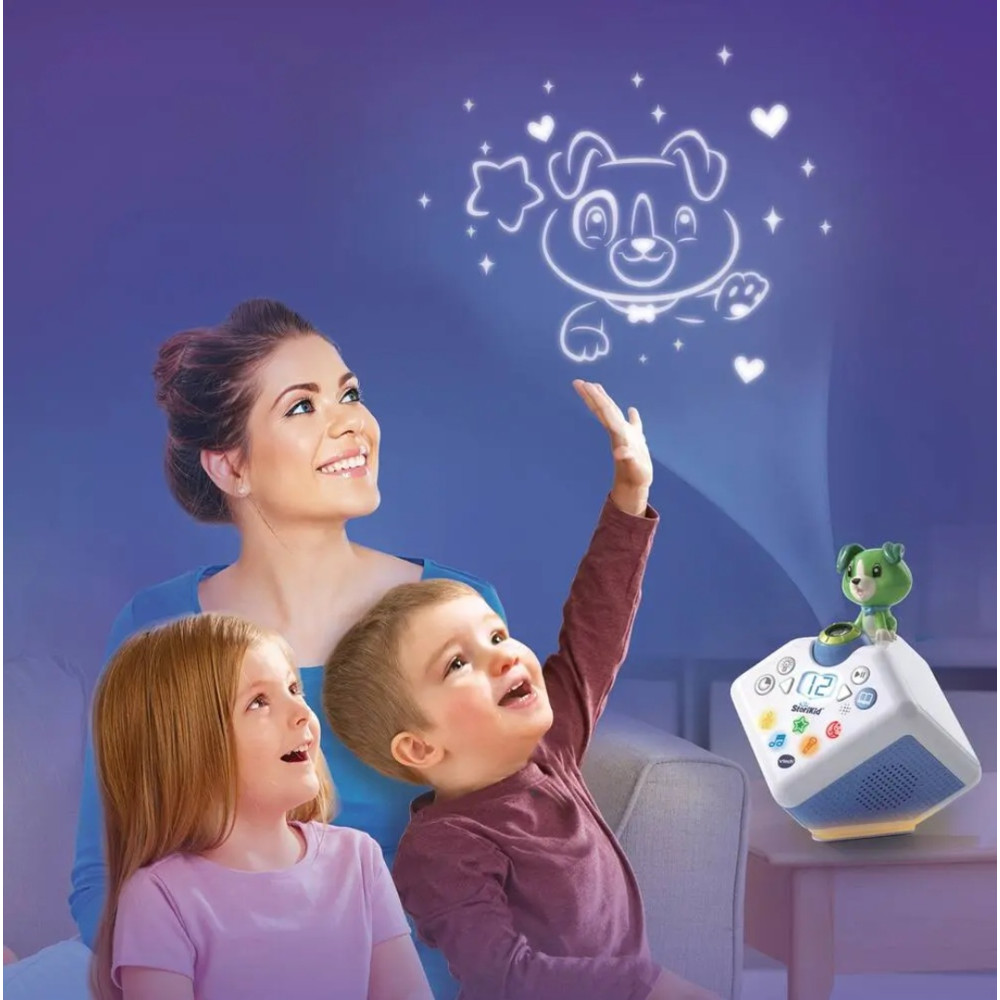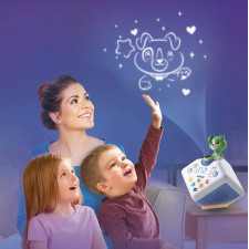 Un conteur d'histoires avec projection lumineuse pour s'endormir en histoire ou en chanson. Les différentes voix des personnages et narrateur, les sons réalistes et les mélodies donnent vie aux histoires. Plus de 80 contenus inclus : 19 contes (Les trois petits cochon, Cendrillon, La Belle et la Bête, La petite sirène...), 16 poésies classiques (poèmes français d'auteurs classiques), 14 fables (La Fontaine et fables d'autres pays), 9 histoires pour s'endormir, 23 chansons. Magique ! La projection accompagne les histoires et chansons et le petit chien réagit et s'anime différemment en fonction du conte choisi. Les parents peuvent également enregistrer leur propre histoire ou chanson personnalisée.