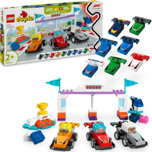 Set de jeu Lego Duplo composé de 3 voitures de course à assembler et de pilotes d’une écurie F1 - Encourage le développement des compétences en résolution de problèmes et stimule l'esprit créatif des enfants, tout en garantissant des heures d'amusement - Assure aux enfants de vivre l’excitation des circuits de course directement dans leur salon - Affiche des détails réalistes comme les drapeaux, les feux de parcours et les ailettes arrières des voitures de courses - Arbore un design riche en couleurs et des pièces de construction conçues pour s’emboîter parfaitement.
