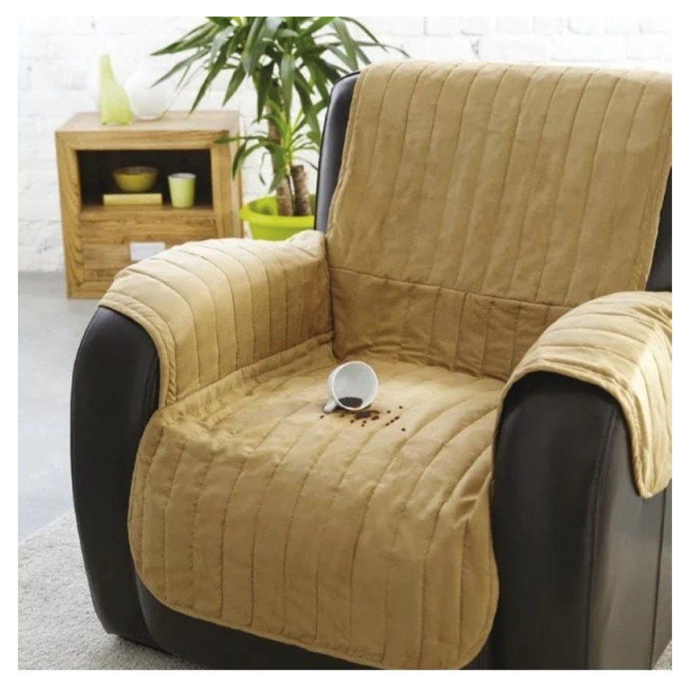 Couvre fauteuil waterproof. Dimensions : 160 x 170 cm environ. Assise : 54 x 56 cm environ. Accoudoirs : 52 x 56 cm environ. Débordement : 54 x 26 cm environ. Dossier : 54 x 86 cm environ. Matière : dessus 100% polyester façon suédine, garnissage 90% polyester 10% coton et dessous en polypropylène. Poids : 660 g environ. Coloris : marron. Résiste à l’eau (waterproof). Dimensions = tolérance de + ou – 5 %.