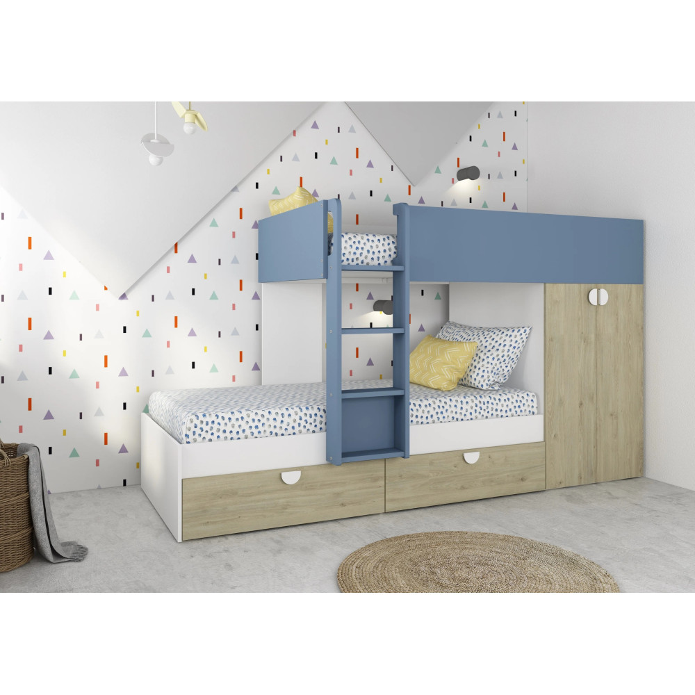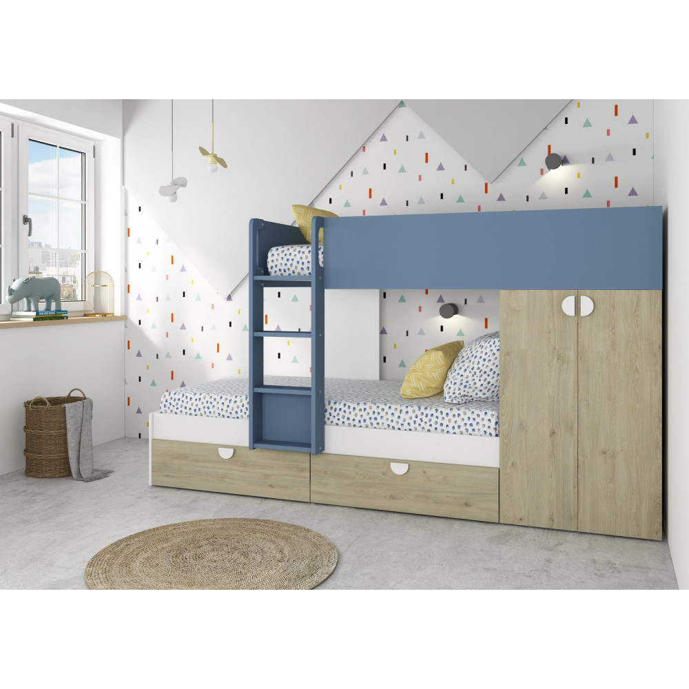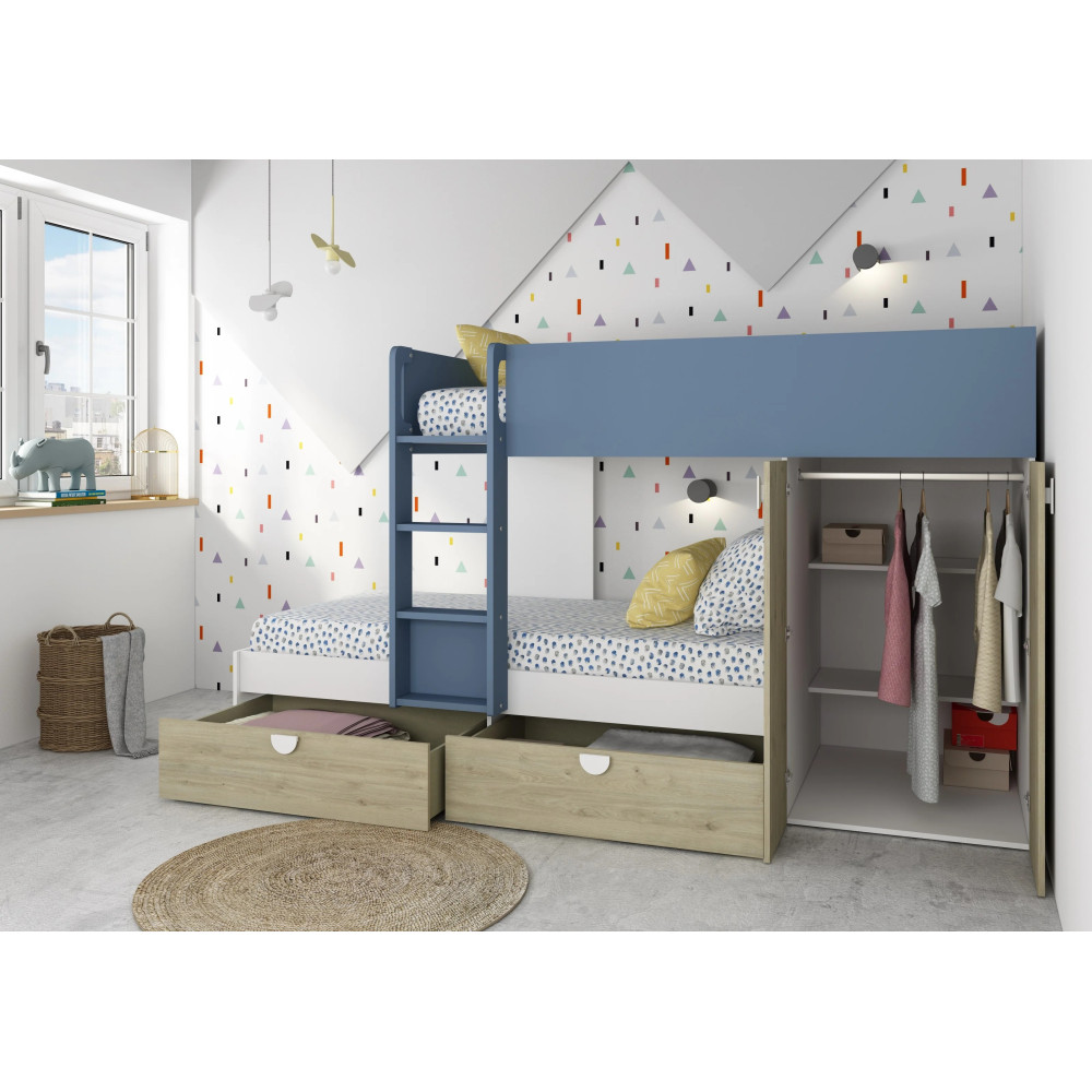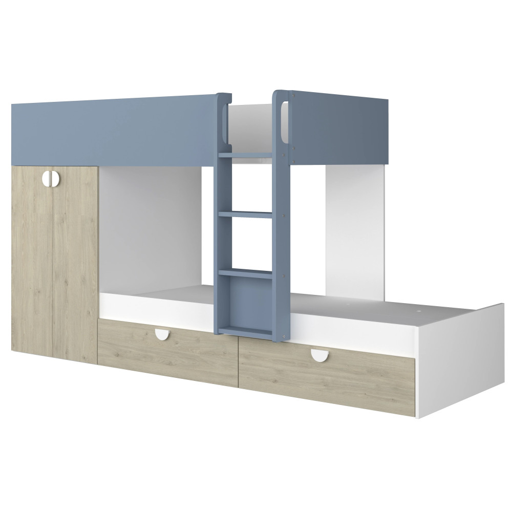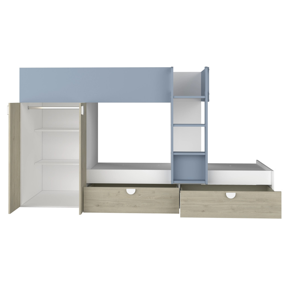 Lit superposé affichant un gabarit compact propice à un gain de place dans la chambre - Constitué de 2 couchages superposés et une échelle intégrée pour accéder facilement au lit du haut - Dimensions du lit superposé : 270 cm de haut, 108 cm de large et 157 cm de long - Doté de barrières de sécurité au niveau du couchage supérieur pour empêcher une chute - Intègre des espaces pratiques pour ranger les vêtements et les jouets - Convient pour une chambre d’enfants - Offre aux petits un espace de couchage tout en favorisant un rangement optimal de leurs effets - Conçu dans un design attractif incluant une finition à effet blanc et bois. vendu avec sommier sans matelas.
