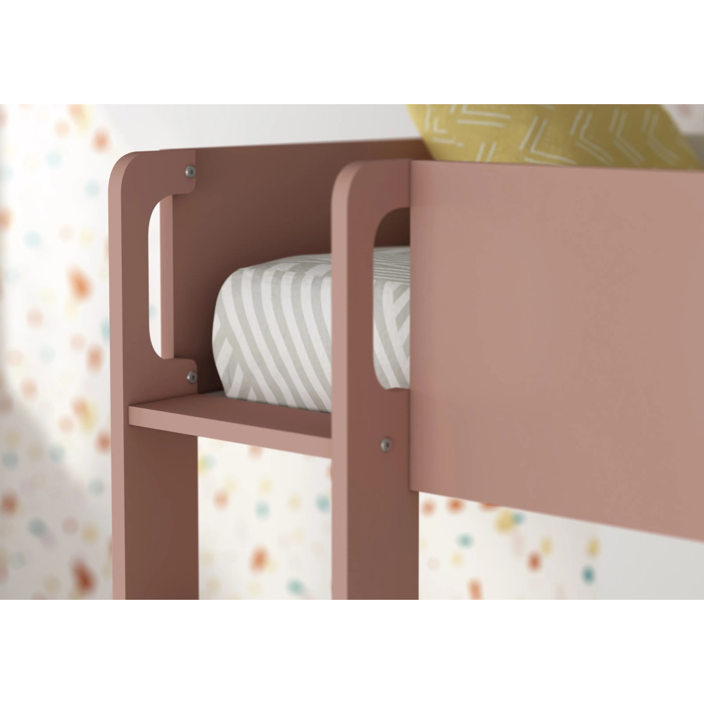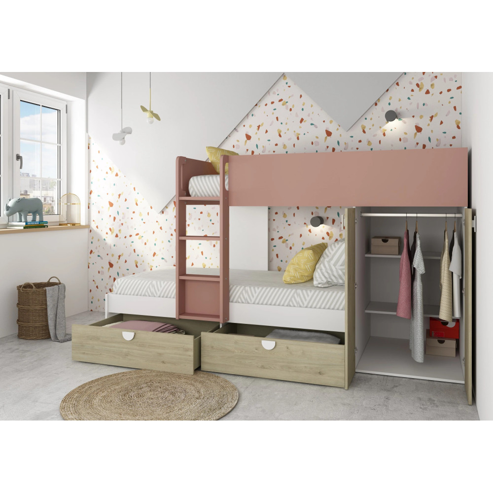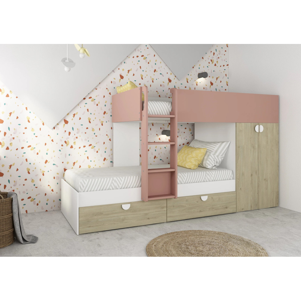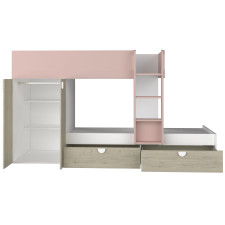 Lit superposé bois 1 place / 1 place. Vendu sans matelas. Dimension des matelas : 90 x 190 cm. Dimension du meuble : 150 x 285 x 110 cm. Nous vous rappelons que le couchage en hauteur ne convient pas aux enfants de moins de 6 ans. Conforme aux exigences de sécurité en vigueur. Coloris : rose et effet bois.