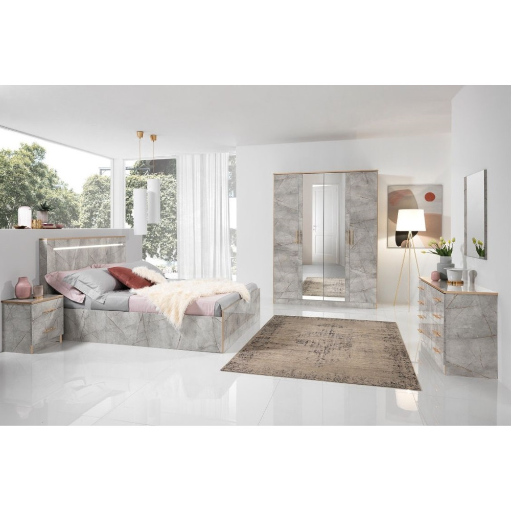 Armoire 4 portes avec 2 miroirs - Lit 160x200 - 2 chevets - Commode avec miroir (Fixation murale non inclus) - Vendu avec sommier sans matelas.