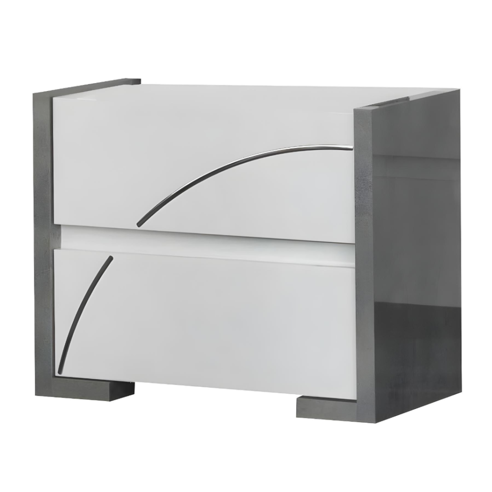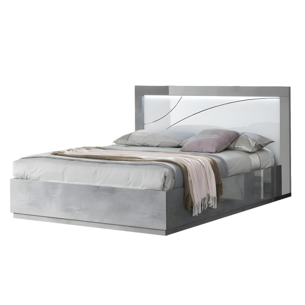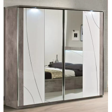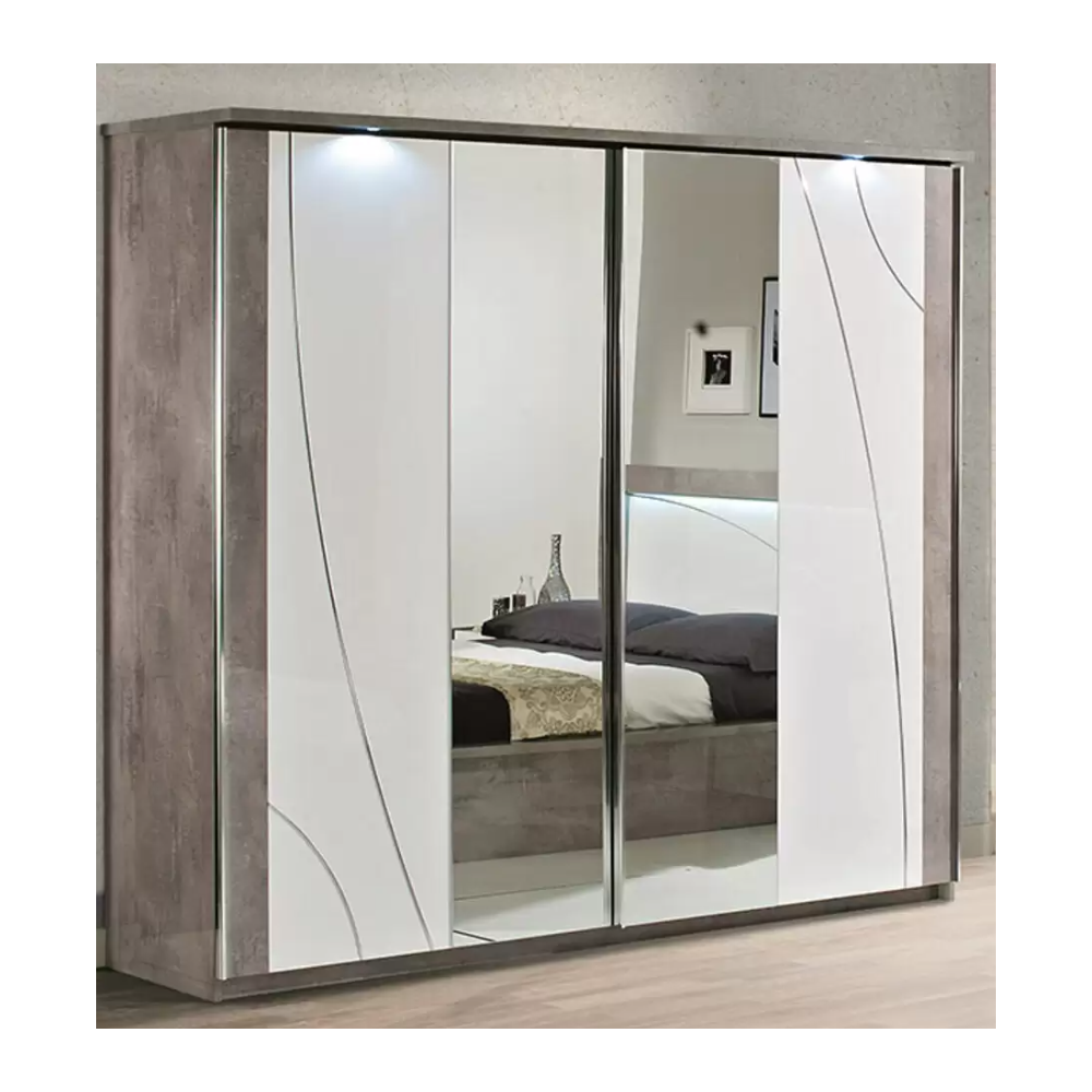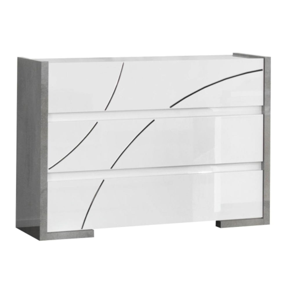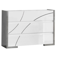 Chambre complète MILANO 160x200 - laquée blanc et gris béton se compose de: Lit 160x200cm - 2x Chevet 2 Tiroirs - Commode 3 Tiroirs - Armoire 4 Portes avec Miroirs - Son look blanc gris béton et chrome modernisera votre déco - Un pack complet et fonctionnel pour aménager entièrement votre chambre avec goût - Structure en panneaux écologiques E1 30 et 18mm - Poignées métal - Glissières et portes avec système de fermeture amortie - Finition : laqué brillant, décorations en plastique chromé - Dimensions : Lit : 213 x 166 x H113cm - Chevets : 85 x 45 x H60cm - Commode : 103 x 45 x H77cm - Armoire : 164 x 59 x H210cm.