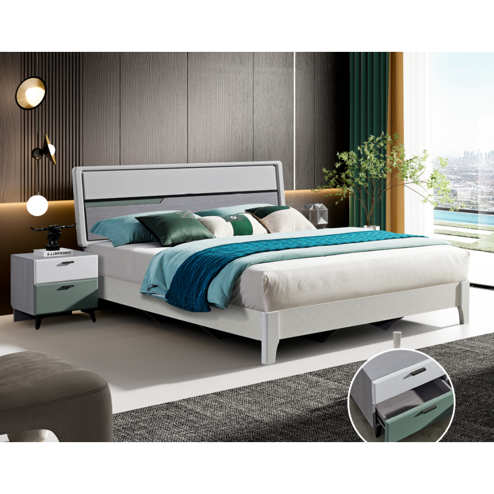 Apportez une touche moderne et raffinée à votre intérieur avec la chambre à coucher 1505. Cet ensemble complet comprend un lit 180x200 cm au design élégant, accompagné de 2 chevets laqués, d’une armoire 6 portes offrant un grand espace de rangement, ainsi qu’une coiffeuse idéale pour organiser vos accessoires. Ses finitions soignées et ses lignes contemporaines créent une ambiance chic et harmonieuse, parfaite pour une chambre confortable et stylée. Vendue avec sommier et sans matelas.