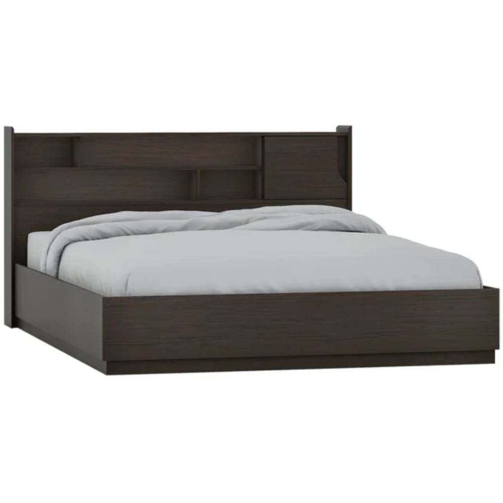 Lit Modi YC QB009022 disposant d’une base pleine complètement fermée - Conçu pour accueillir un matelas mesurant 140 cm de large pour 190 cm de long - Fabriqué avec une structure en panneau de particules et MDF de couleur anthracite sombre - Dispose d’une tête de lit incluant des étagères de rangement ouvertes et une cavité fermée pour disposer des objets plus personnels - Convient pour une chambre parentale ou d’amis.