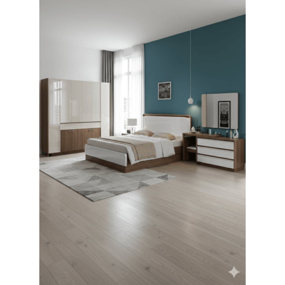 Chambre à coucher incluant un lit mesurant 180 x 200 cm (environ 2 places) et composé d’une tête de lit simpliste avec un coloris blanc pur et des flancs à motifs boisés - Dispose d’une coiffeuse originale constituée d’un meuble de rangement à 3 grands tiroirs et d’un siège pour s’asseoir et se refaire une beauté confortablement - Des objets décoratifs peuvent être disposés sur le plateau supérieur de la coiffeuse - Inclut une commode affichant une texture mixte avec des motifs blancs et boisés, montée sur un socle compacte et des petites pattes de soutien - Présente une face avant avec des portes avec sans poignée.