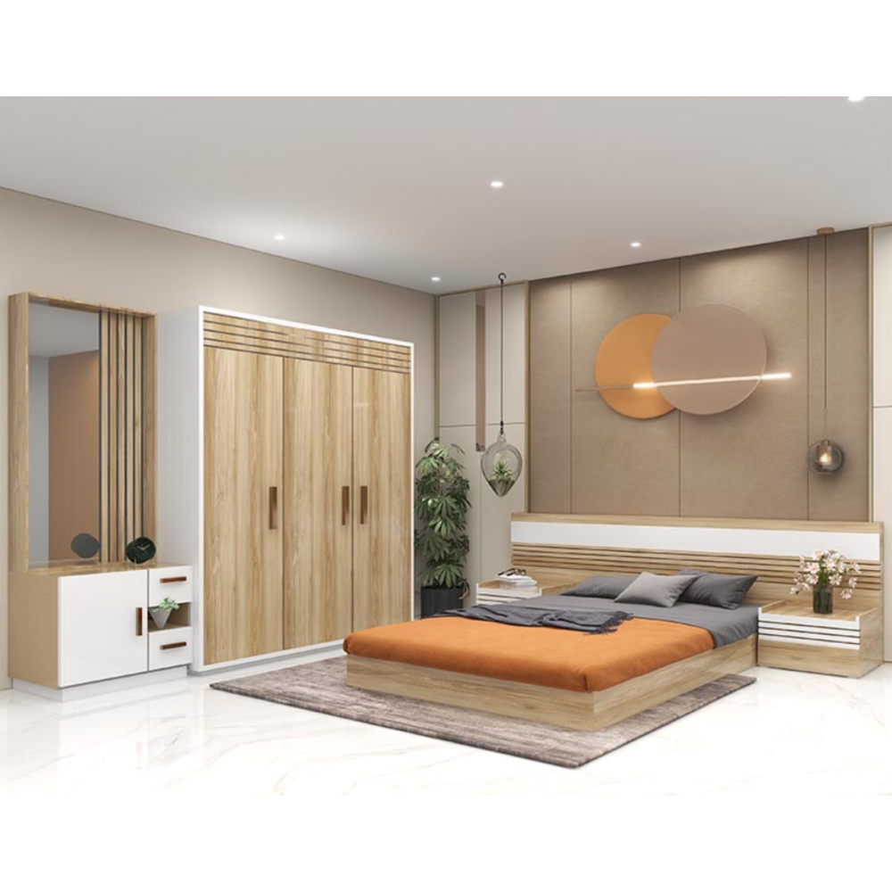Chambre à coucher complète présentant un design soigné avec un coloris blanc partiel et des parties boisées - Equipée d’un grand lit et adapté pour installer un matelas de 160 cm de large et 200 cm de long - Dispose d’une grande armoire dotée de 3 portes à ouverture indépendante avec des poignées intégrées directement dans la porte - Possède aussi une commode incluant 2 tiroirs et 1 porte pour le rangement d’accessoires divers et personnels, et un grand miroir - Propose 2 chevets de lit à poser directement à côté de la tête de lit et embarquant des tiroirs pour le rangement.