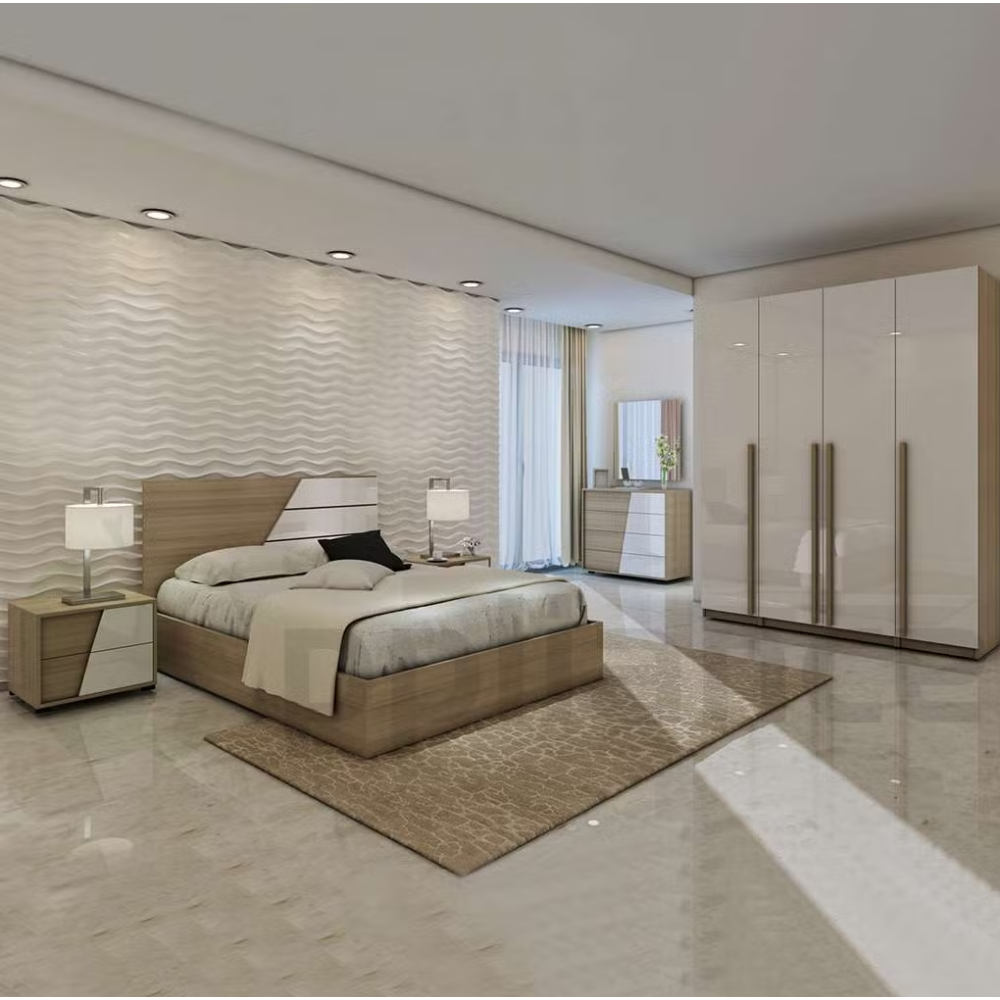 Chambre à coucher présentant un set de meubles prêts à être installés dans une chambre parentale ou une chambre d’amis - Dispose d’une armoire 4 portes avec longues poignées fines - Inclut un lit simple et moderne avec une tête de lit dégagée et ornée de motifs réguliers de couleur blanche, convenable pour un matelas de 160 cm de large et 200 cm de long - Embarque une coiffeuse moyenne constituée de 4 tiroirs disposés les uns sur les autres à la verticale et 2 chevets affichant un design uniforme avec celui du lit.