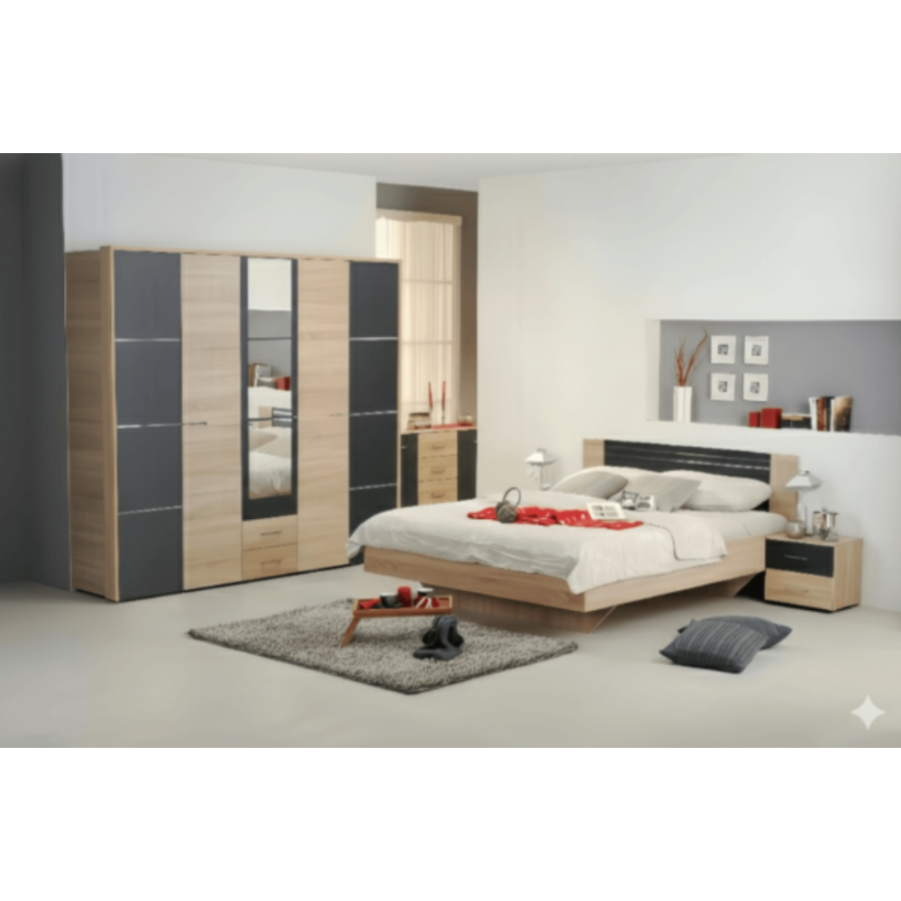Chambre à coucher proposant un ensemble de meubles prêts à l’emploi - Embarque 1 lit posé sur un socle original et pouvant accueillir un matelas de 160 cm de large et 200 cm de long - Possède 2 chevets conçus dans le même design et proposant chacun 2 tiroirs - Intègre une commode dotée de 4 tiroirs servant à ranger du linge ou des accessoires divers - Compose une armoire équipée de 5 portes avec un insert de miroir au centre du meuble et dispose des étagères de rangement internes de part et d’autre, ainsi qu’un espace avec tringle pour cintrer les vêtements.