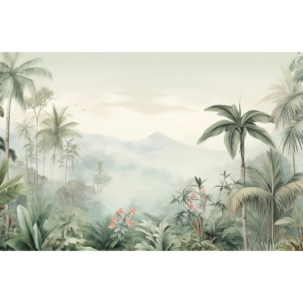 Toile Suspendue Brume Jungle - Dimensions : 65 x 97 cm - Présente un paysage tropical étendu baigné dans des couleurs pastels douces, où chaque plante et fleur est placée avec soin pour former un ensemble harmonieux. Les montagnes en arrière-plan offrent un sentiment de majesté et d'échelle et la flore en fleurs ajoute une touche subtile de couleur et de vie. Irait bien avec n'importe quel décor, une idée de cadeau parfait.
